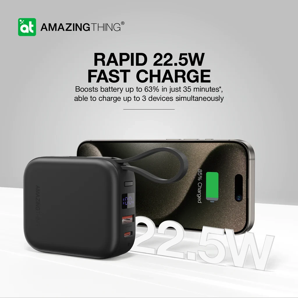 The AmazingThing Thunder Go Power Bank is made for fast, on-the-go charging in Qatar. With 10,000mAh capacity and dual built-in USB-C cables, you can charge two devices without carrying extra wires. Its sleek black design is perfect for daily use, travel, or office life.