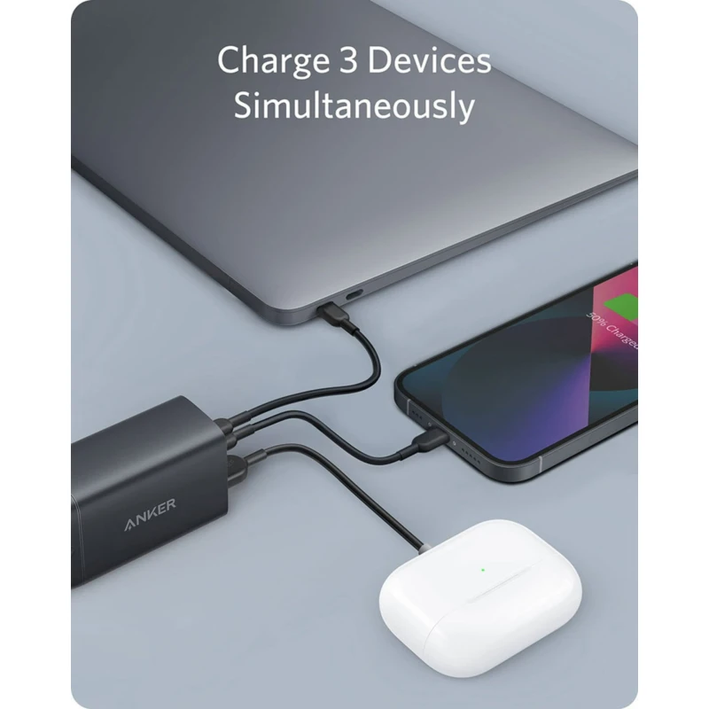 The Anker PowerPort III 3-Port 65W GaN Charger is a compact and powerful charger that lets you fast-charge up to three devices simultaneously. Using advanced GaN II technology, it delivers efficient high-speed charging for smartphones, tablets, and USB-C notebooks in a travel-friendly design.