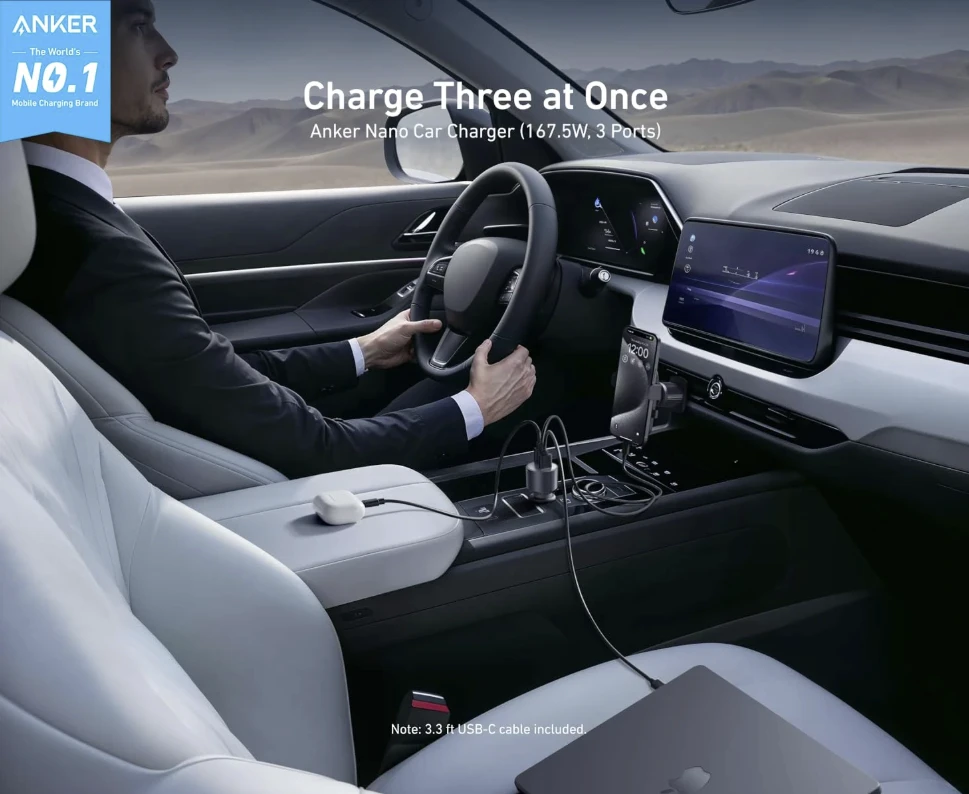 The Anker Nano Car Charger (B2737HA1) is a compact powerhouse designed to keep your devices charged during your travels. With a total output of 167.5W, it features two USB-C ports delivering 100W and 45W respectively, and a USB-A port providing 22.5W. This allows you to charge up to three devices simultaneously, including laptops, smartphones, and tablets. The charger is compatible with various input voltages (12V–24V DC), making it suitable for most vehicles. It comes with a 3.3 ft USB-C to USB-C cable, ensuring fast and efficient charging. Its ultra-compact design ensures it won't clutter your car's interior, while advanced safety features protect your devices from overvoltage, overheating, and short circuits