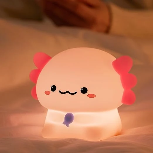 The Baby Newt Silicone Night Lamp is an adorable axolotl-inspired lamp with sparkling eyes, a sweet smile, and a cute little fish in its hands, making it both a decoration and a comforting light. Made from safe, non-toxic, and thick silicone, it is soft to touch, skin-friendly, and resistant to falls and collisions. The lamp emits a warm, flicker-free glow that is gentle on the eyes, perfect for children and adults alike. With three adjustable brightness levels and a 30-minute timer, it provides flexibility for bedtime, reading, or nursery use. A built-in rechargeable battery makes it portable and wireless, ideal for bedrooms, dorms, camping, or traveling. Packaged beautifully, it also makes a perfect gift for birthdays, holidays, or special occasions.