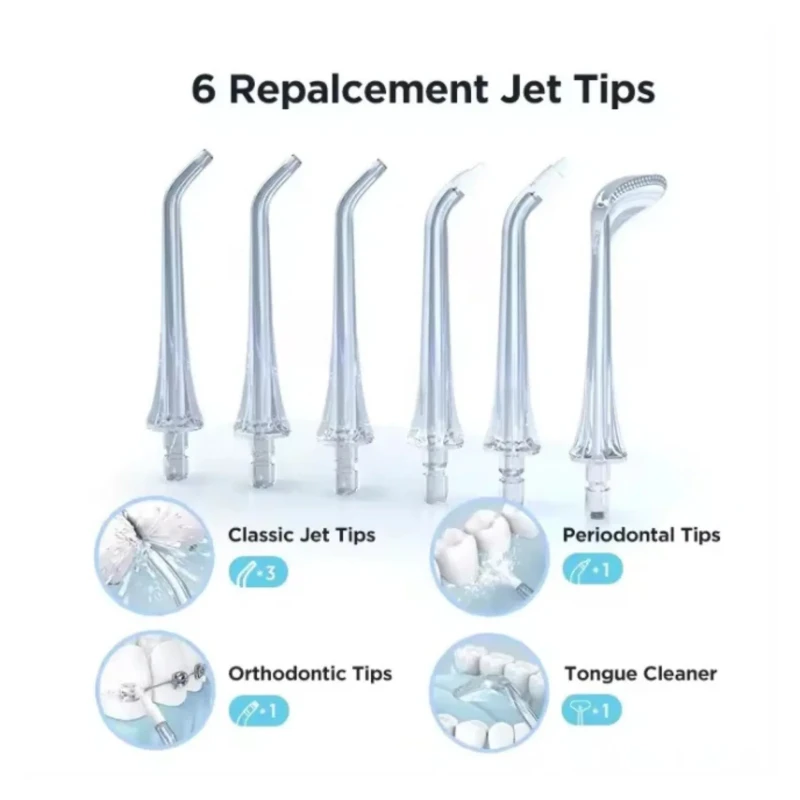 Includes 6 replacement jet tips: 3 classic, 1 periodontal, 1 orthodontic, and 1 tongue cleaner.