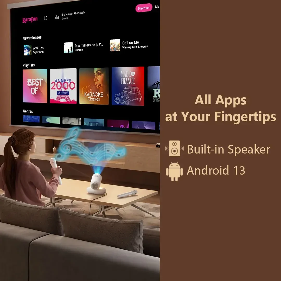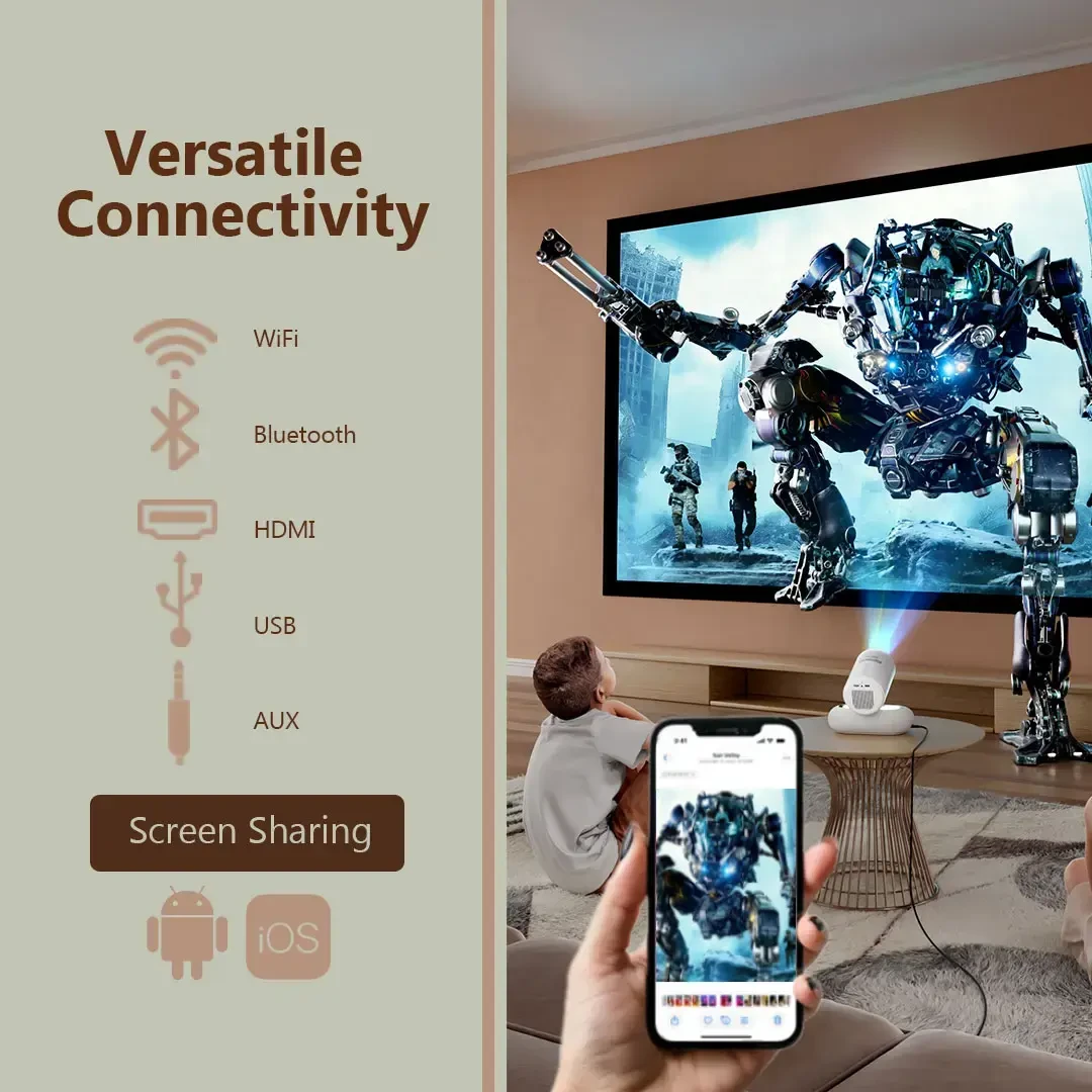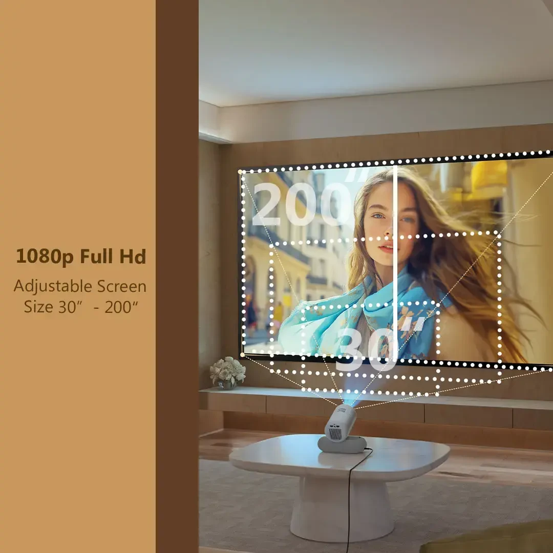The Porodo Lumacast Smart Full HD Projector Auto Focus & Keystone is designed to turn any wall into a personal cinema, whether indoors or outdoors. With Full HD 1080P resolution and a projection size from 30" up to a huge 200", it delivers sharp, immersive visuals for movies, matches, and presentations. Auto Focus and Auto Keystone adjust the image automatically, keeping it clear and properly aligned without manual tweaking. Running on Android 13 with wireless screen mirroring, you can stream content directly from your apps or phone. The built-in 10W speaker and Bluetooth 5.4 support make it easy to enjoy better audio, while HDMI, USB-A, and a 3.5mm earphone jack offer flexible connectivity. At just 1.3kg with a 30,000-hour light source, it’s a portable, long-lasting projector ready for home cinema nights, gatherings, or casual outdoor setups.