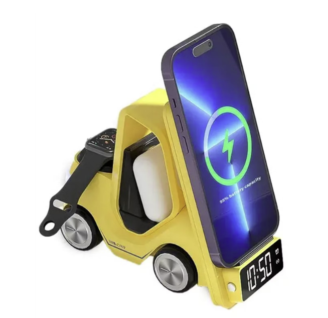 Introducing the ultimate convenience in charging technology; the Green Lion Forklift 5-in-1 Wireless Charger. This sleek and innovative device combines the power to charge your smartphone, smartwatch, and earbuds simultaneously, all while doubling up as a digital clock and night light. With a charging capacity of 15W for your smartphone, 2.5W for your smartwatch, and 5W for your earbuds, this versatile charger ensures speedy and efficient charging for all your devices. But that's not all! The unique forklift-shaped design adds a touch of playful charm to any space, making it an eye-catching addition to your home or office. Say goodbye to messy cables and embrace the convenience of a single, multipurpose charging solution that keeps your devices powered up while keeping you on schedule with its digital clock display and creating a soothing ambiance with its built-in night light. Features: Digital Clock Forklift Design Compact Night Light Wireless Charging Fast Charging