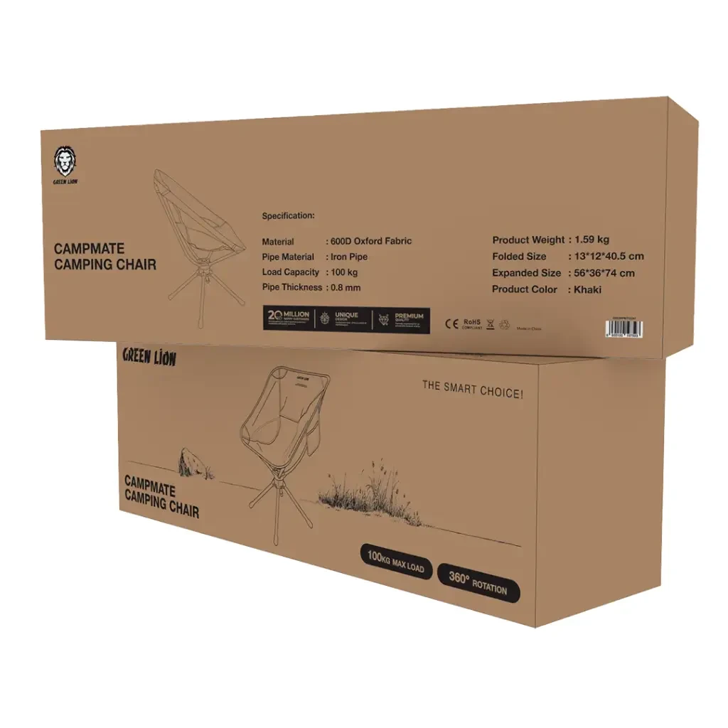The Green Lion CampMate Camping Chair is built for outdoor enthusiasts seeking comfort, durability, and versatility. Made from heavy-duty 600D Oxford fabric and a sturdy 0.8mm iron pipe frame, it supports up to 100kg while withstanding wear and tear. The ventilated backrest ensures comfort in warm weather, and the convenient storage pocket keeps essentials within reach. Its foldable design allows for easy packing and portability, while the 360° swivel feature provides flexible movement in any direction. Perfect for camping, picnics, or outdoor events, this chair combines comfort, practicality, and long-lasting performance.