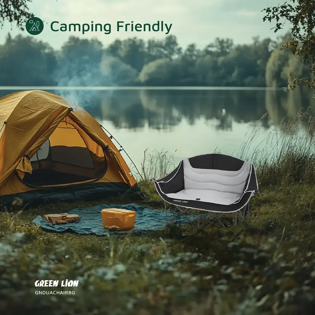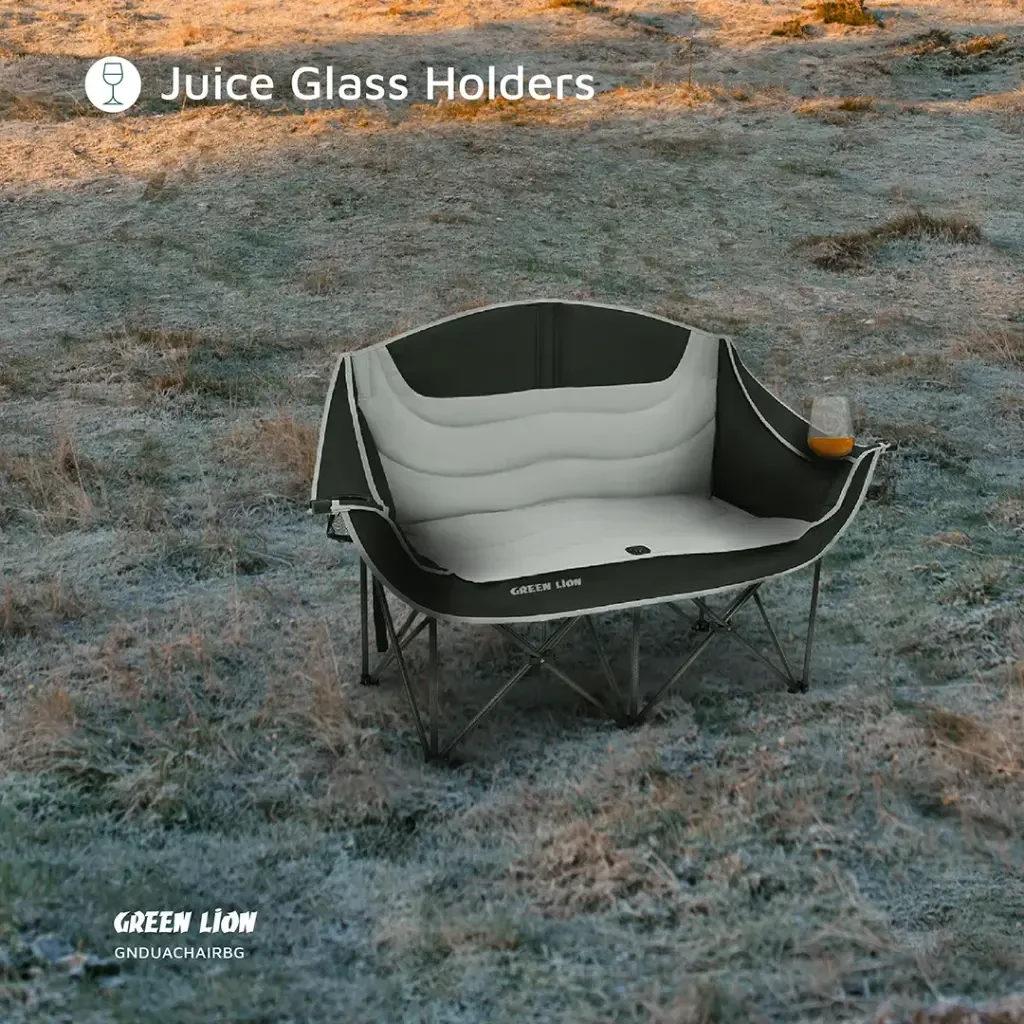 The Green Lion Double Camping Chair combines comfort, durability, and convenience, making it perfect for outdoor adventures. Made from premium 600D Oxford fabric and sturdy steel pipes, it supports up to 200 kg, comfortably accommodating two people. The chair features juice glass holders, a strong safety lock for stability, and a foldable design for easy transport and storage in the included bag. Measuring 140 × 50 × 90 cm when open and 25 × 20 × 90 cm when folded, it is ideal for camping, picnics, or a day at the beach, offering style, functionality, and quick setup.