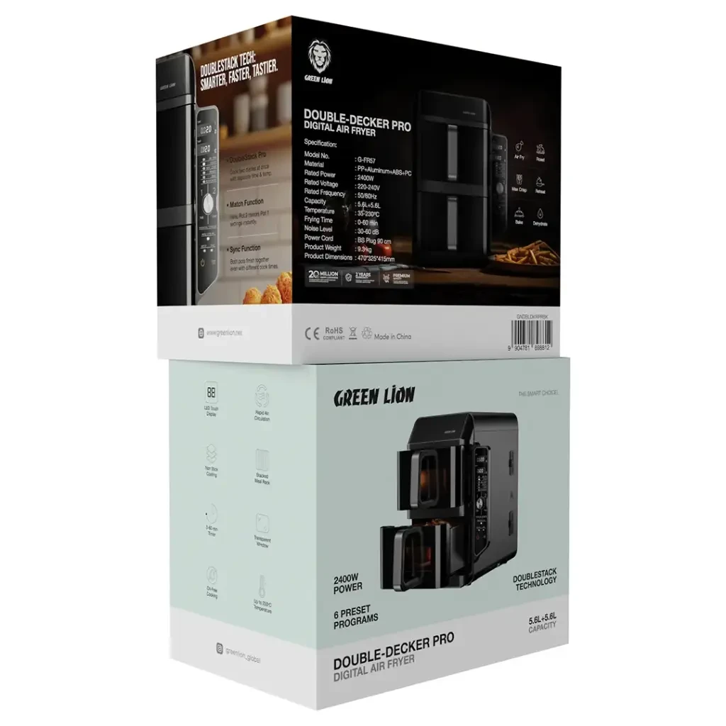 The Green Lion Double-Decker Pro Digital Air Fryer is the ultimate kitchen partner for healthier and faster cooking. With a powerful 2400W motor and a large 10.2L total capacity (5.6L + 5.6L), it is perfect for family meals or gatherings. Featuring a wide temperature range from 35°C to 230°C and a 0-60 minute timer, this fryer gives you full control over your recipes. Its LED touch display makes operation easy, while the double-stack technology and stacked meal rack maximize cooking space. Rapid air circulation technology ensures oil-free, crispy, and evenly cooked meals, while the non-stick coating simplifies cleaning. With 6 preset programs for frying, roasting, baking, dehydrating, reheating, and more, plus a transparent window to monitor your food, this air fryer combines versatility, performance, and convenience in one.