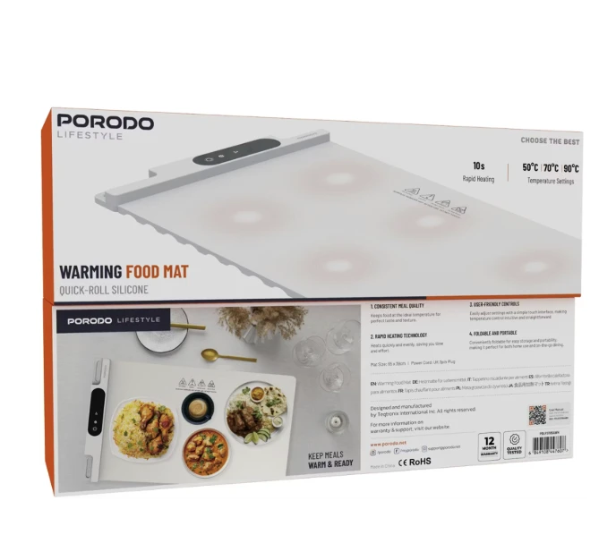 The Porodo Lifestyle Warming Food Mat is designed to keep your meals hot, fresh, and ready anytime with its spacious XL heating surface and rapid heat-up performance. Built with fast-heating technology, the mat reaches warming temperature within just 10 seconds, making it perfect for busy routines and mealtime convenience. With adjustable heating levels at 50°, 70°, and 90°, you can easily choose the ideal temperature for any dish. Its whole-block heating system ensures heat is distributed evenly across the mat, preserving food quality and maintaining warmth for longer periods. The quick-roll silicone design allows hassle-free storage, while its compatibility with different bowls, lunch boxes, and serving trays makes it suitable for everyday home or office use. A user-friendly control panel adds simplicity to your heating experience, delivering comfort and efficiency in one sleek solution.
