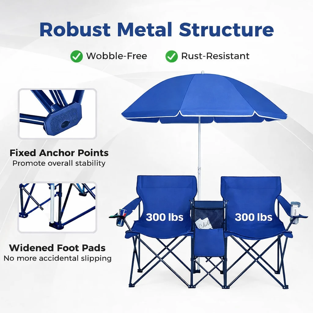 The Portable 2-Seat Folding Camping Chairs with Umbrella is the perfect setup for relaxing outdoors with a partner, friend, or family member. Designed with comfort and convenience in mind, this dual-chair design includes a built-in center table, cooler bag, beverage holders, and a handy side pocket. The adjustable and removable umbrella provides shade whenever needed, while the weather-resistant oxford fabric and strong steel frame ensure durability in outdoor environments. Easy to fold, store, and carry, this 2-seat chair set is ideal for beaches, parks, camping trips, backyard lounging, and picnics.