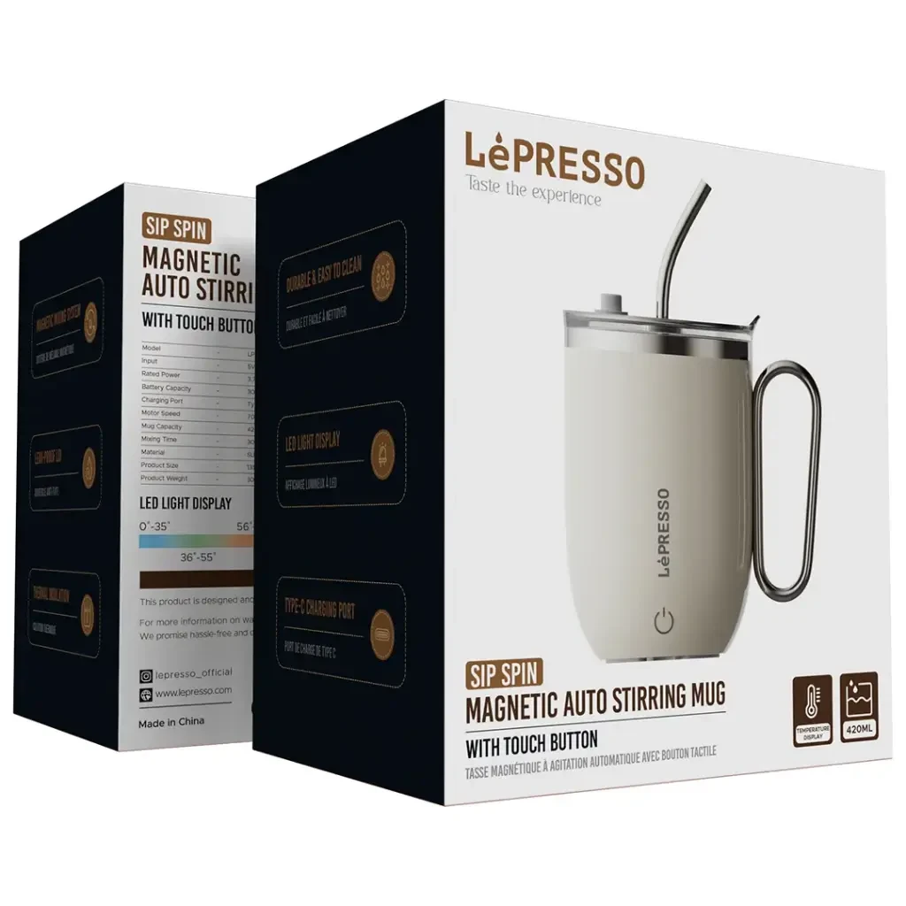 The LePresso Sip Spin Magnetic Auto-Stirring Mug is crafted for beverage lovers who enjoy effortless mixing and a premium drinking experience. With advanced magnetic stirring technology, the mug automatically blends your drink to perfection at 7000±10% RPM in just 30 seconds, ensuring smooth and consistent results every time. Its 420mL capacity is ideal for coffee, tea, protein shakes, or any powdered drink.