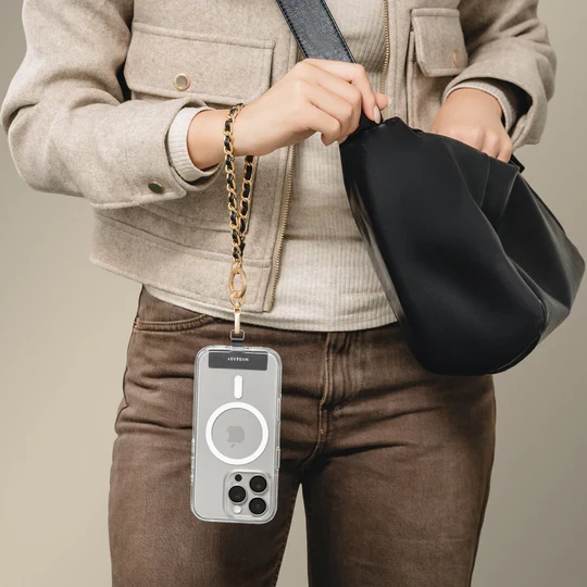 This elegant wrist strap combines premium leather and hypoallergenic metal for a timeless, refined look. The durable metal hoop connections ensure long-lasting use, while the 360° rotating buckle allows quick attachment and detachment. Includes a premium strap card that fits most phone cases without blocking the charging port.