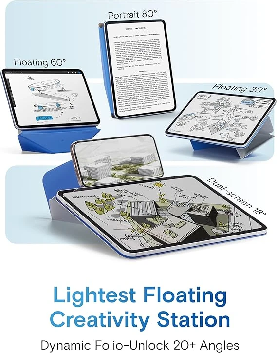 The MOFT Dynamic Folio Case brings together minimalist design and versatile functionality. With 20+ adjustable angles, it flows effortlessly from work to creativity, keeping your iPad aligned with your needs. Its ergonomic floating mode lifts your iPad by 2 inches, providing comfortable angles between 30° and 60° for typing, sketching, or viewing. Weighing only 10.5oz, it offers slim, lightweight protection without bulk. Built with super-strong N52 magnets and a durable fiberglass structure, it ensures stability and secure support. Made from scratch-resistant MOVAS vegan leather, it delivers durability, sustainability, and premium comfort. The modular pen holder is optional, giving you flexibility for your setup. Perfect for creators, professionals, and anyone who needs dynamic flexibility on the go.
