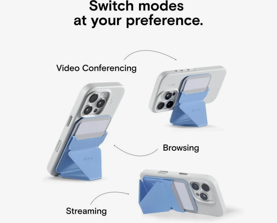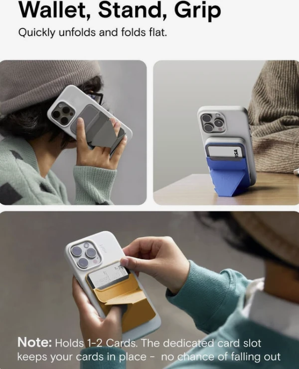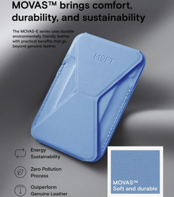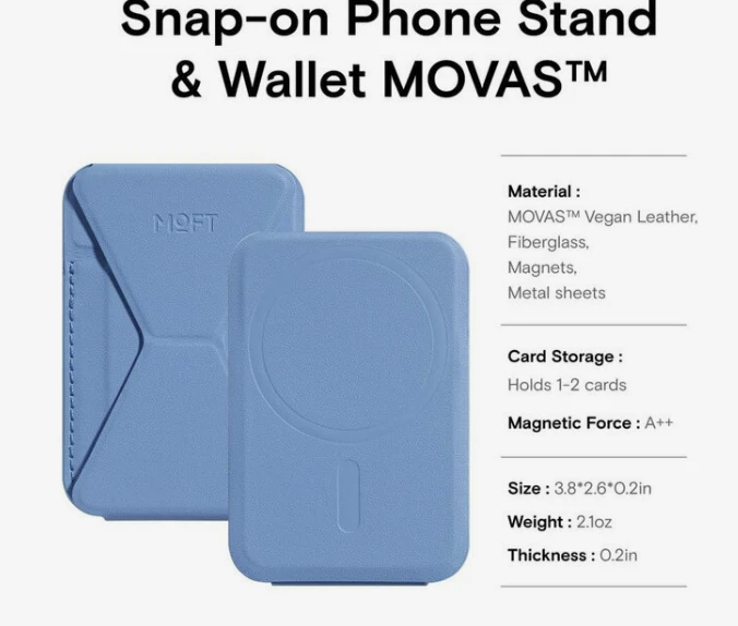 The MOFT Snap-On iPhone Stand & Wallet (MOVAS) is a sleek and practical accessory designed to simplify your everyday carry. It features a built-in wallet that holds up to two cards, keeping your essentials within easy reach. The magnetic stand offers three versatile viewing modes—Portrait, Landscape, and Floating—providing hands-free convenience for watching videos or video calls. Designed to attach securely to MagSafe-compatible iPhones with a strong 15 Newton magnetic force, it’s easy to snap on and remove. Made from durable MOVAS™ vegan leather, this accessory combines style and functionality while seamlessly fitting with Apple’s MagSafe cases and other compatible options.