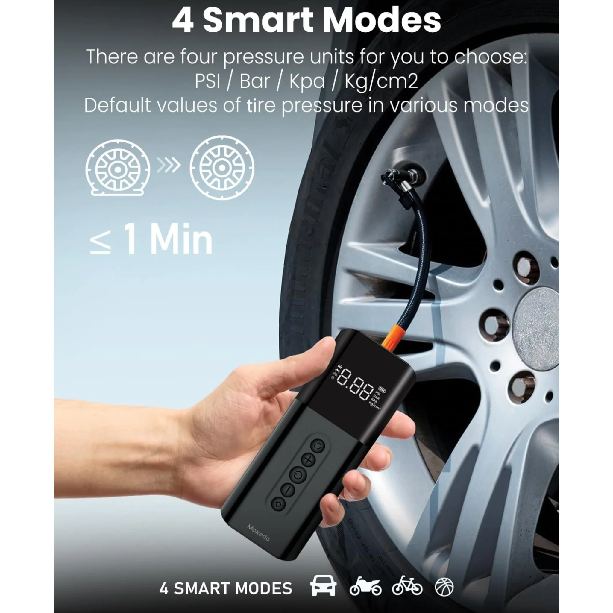 • LED LARGE SCREEN: Moxedo air dynamo portable air pump is equipped with a large LED screen, which is easy to read and observe the tire pressure status. The screen will display real-time tire pressure with bright numbers and automatically stop when the tire pressure reaches the preset value. This air pump is equipped with a precise pressure sensor that improves tire pressure detection accuracy to 150 PSI. It has 4 pressure units.