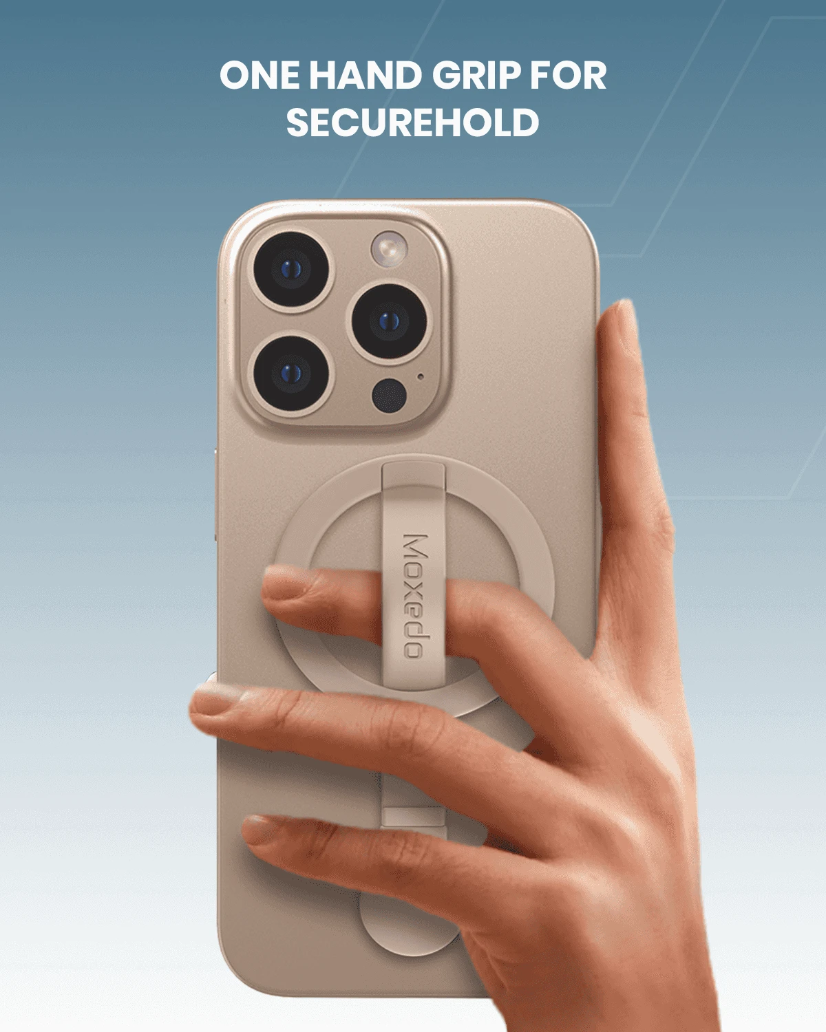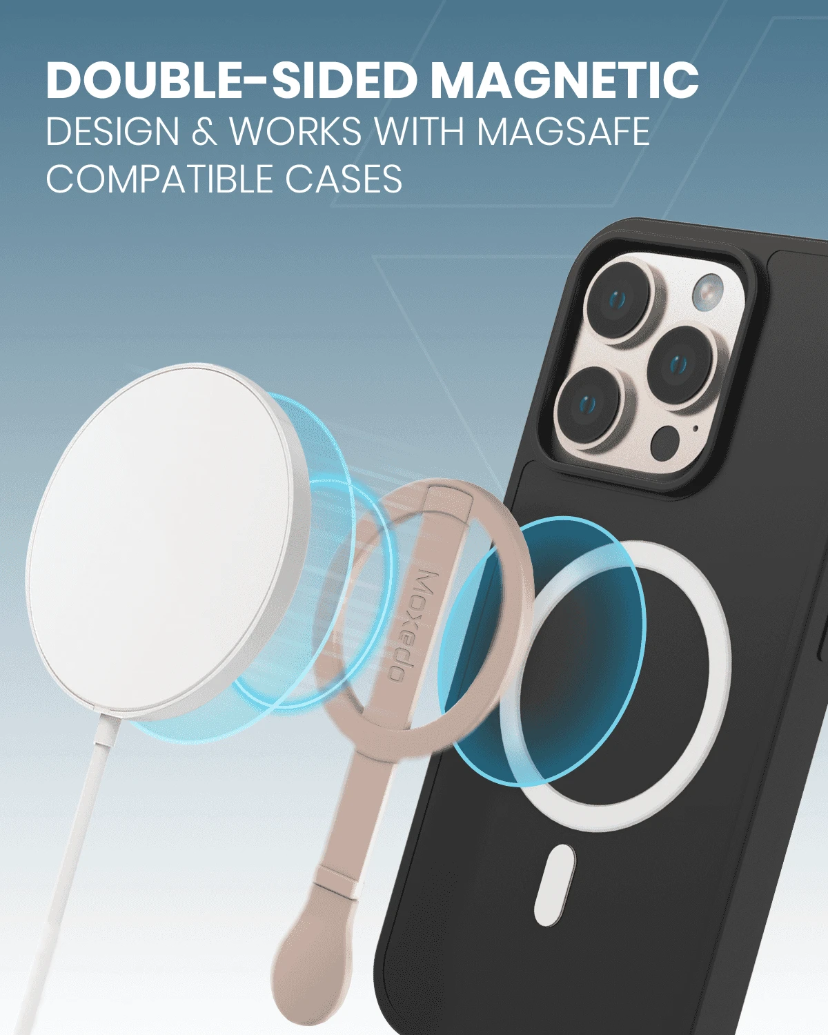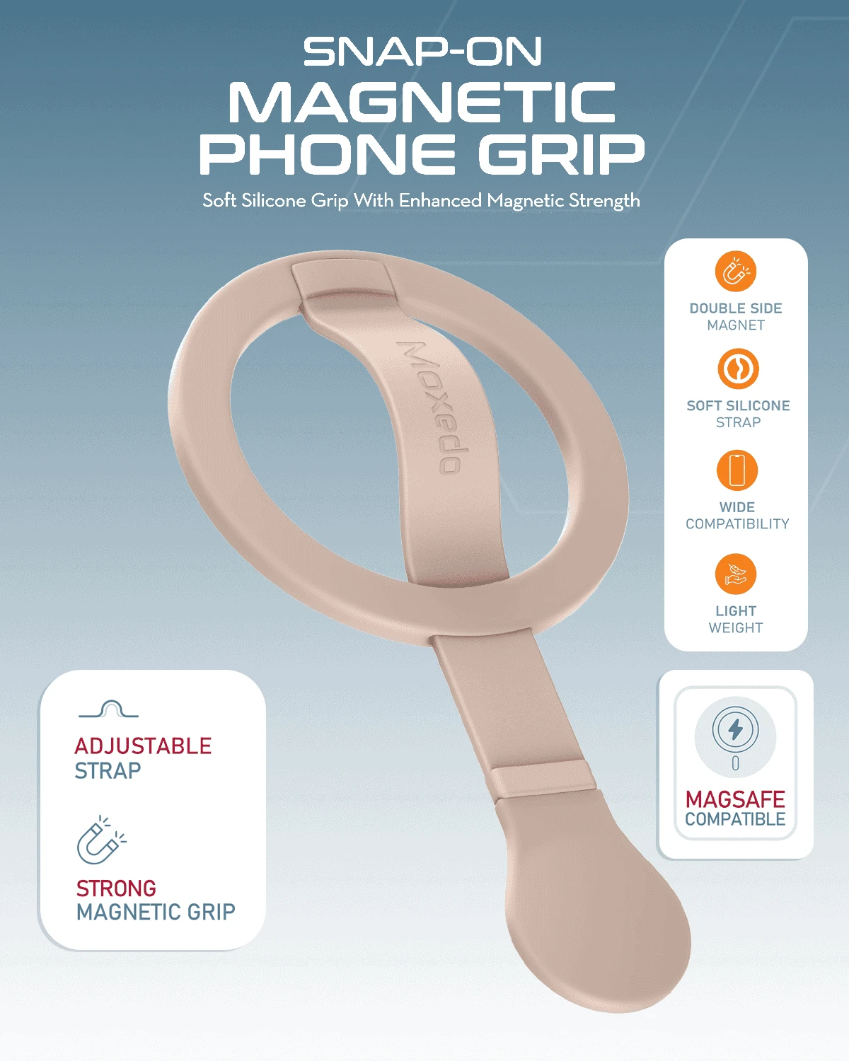 The Moxedo Snap-On Magnetic Phone Grip offers a strong and reliable hold using powerful N52 magnets, keeping your phone secure and preventing accidental drops. Its lightweight, ergonomic loop grip with a soft elastic strap ensures comfort during scrolling, texting, and taking photos. The 360° rotating design makes it easy to find the perfect angle for watching videos, reading, or video calls. Installation is quick—just align with your phone’s magnetic ring—and it’s just as easy to remove. Compatible with MagSafe-enabled devices, magnetic cases, and comes with a metal ring for non-MagSafe phones.
