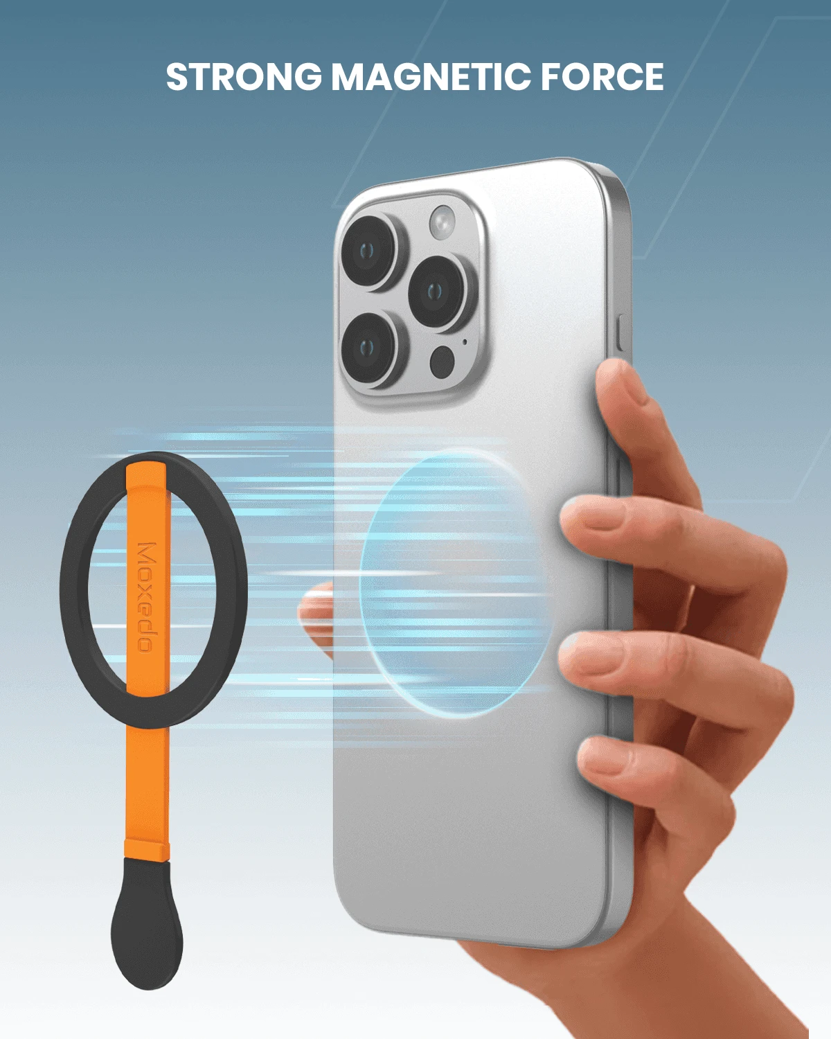 The Moxedo Snap-On Magnetic Phone Grip offers a strong and reliable hold using powerful N52 magnets, keeping your phone secure and preventing accidental drops. Its lightweight, ergonomic loop grip with a soft elastic strap ensures comfort during scrolling, texting, and taking photos. The 360° rotating design makes it easy to find the perfect angle for watching videos, reading, or video calls. Installation is quick—just align with your phone’s magnetic ring—and it’s just as easy to remove. Compatible with MagSafe-enabled devices, magnetic cases, and comes with a metal ring for non-MagSafe phones.