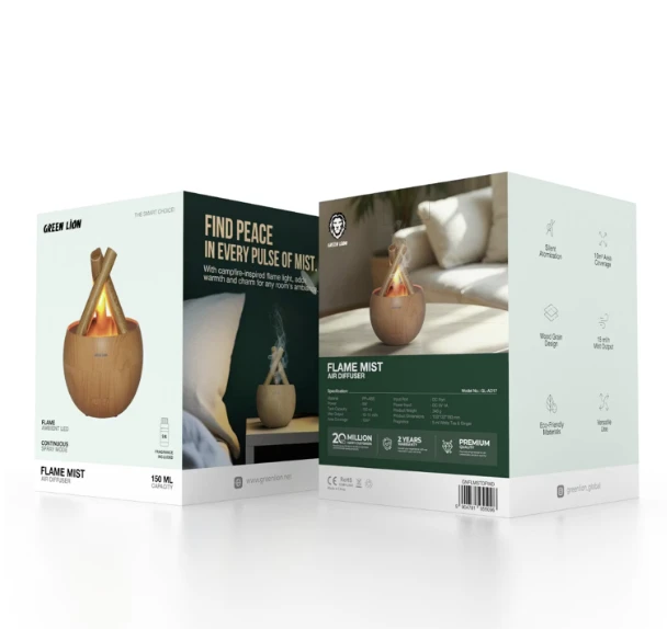 The Green Lion Flame Mist Air Diffuser transforms any room into a calm and refreshing sanctuary with its soothing mist and warm flame-style LED ambiance. Designed with eco-friendly PP + ABS materials and a premium wood-grain finish, it blends beautifully into home or office décor. With a 150mL tank capacity and a mist output of 10–15mL/h, it effectively covers areas up to 10m², making it ideal for bedrooms, living rooms, workspaces, and relaxation corners. The diffuser operates silently through advanced atomization technology, creating an instant peaceful environment.