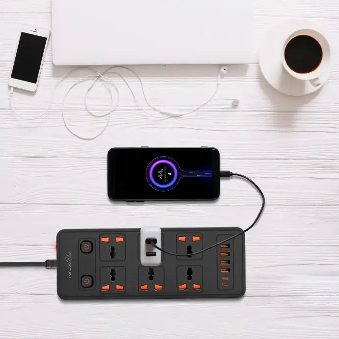 Introducing the Porodo Blue 6 AC - Dual Switch Power Strip for efficiently and safely powering your devices. This heavy-duty power strip will work within a wide range of voltages, from 110 to 250V, and at a frequency of 50-60Hz while sustaining up to 3000W of rated power. It provides a maximum current of 13A, suitable for heavy-duty applications in homes or offices. Meanwhile, the power strip with two USB-C and four USB-A can provide DC 5V/3.4A output and charge several devices easily and quickly. In addition, safety is ensured by the built safety shutters, which prevent accidental shocks, making them family-friendly and reliable. The UK 3-pin plug and dual power switch control make it easy to manage the power safely and securely. It can let you switch off the unused socket to save energy. Be it to power appliances or charge your gadgets, the Porodo Blue 6 AC Power Strip is your safe, powerful, and flexible solution in modern households.