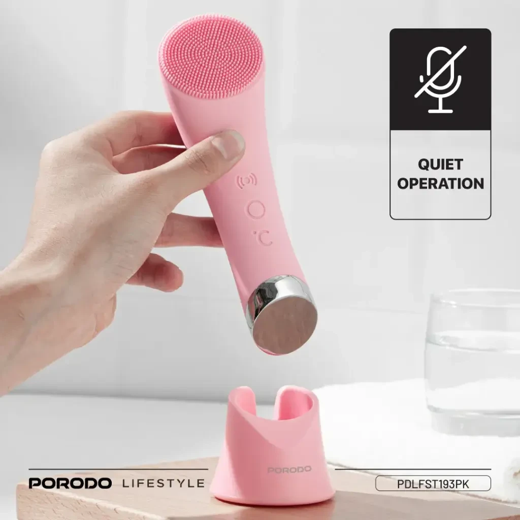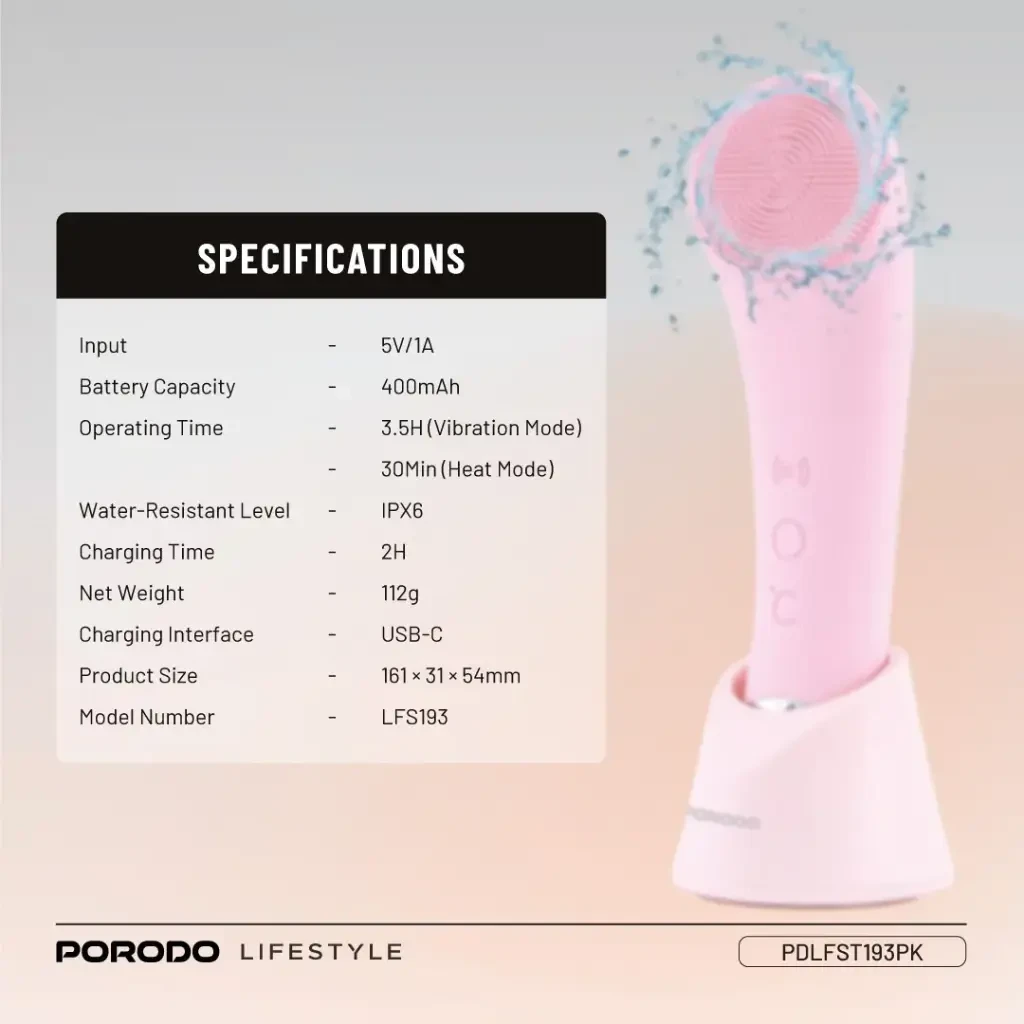 The Porodo Lifestyle Sonic Vibration Facial Cleansing Brush brings your skincare routine to the next level with deep yet gentle cleaning. Equipped with soft silicone bristles, it not only cleans but also massages and exfoliates, leaving the skin refreshed and smooth. Its 6000RPM high-frequency sonic vibration ensures thorough cleansing while remaining gentle on sensitive skin. With adjustable vibration modes and a soothing warm compress option, you can tailor treatments to your personal needs. Compact, lightweight, and quiet in operation, this brush is designed for daily use. The IPX6 water resistance keeps it safe from splashes, while the 400mAh rechargeable battery provides up to 3.5 hours of use in vibration mode or 30 minutes in heat mode, charging fully in just 2 hours via USB-C. A perfect beauty companion for glowing, healthy skin.