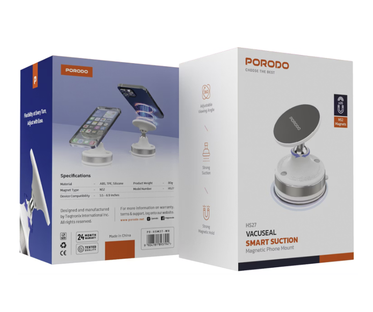 Porodo Vacuseal Smart Suction Magnetic Phone Mount Secure your phone effortlessly with the Porodo Vacuseal Mount. Featuring a powerful N52 magnet and strong suction base, it holds devices from 5.5 to 6.9 inches firmly in place—even on bumpy roads. The adjustable angle ensures optimal viewing for calls, media, or navigation. Made with durable silicone, ABS, and TPE, it's perfect for use at home, work, or in the car. Key Features: Strong N52 magnetic hold Fits phones 5.5" to 6.9" Adjustable viewing angle Secure suction base Durable materials (silicone, ABS, TPE) Ideal for home, office, or car use