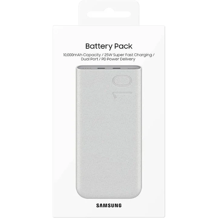 Stay powered up wherever you go with the Samsung 10000mAh 25W Power Bank. Designed for fast, efficient charging, this sleek beige power bank features a large 10,000mAh capacity and dual-port output, allowing you to charge two devices simultaneously. With Super Fast Charging (25W) support via USB-C, it delivers power quickly to compatible smartphones, tablets, or other USB-powered devices. Its slim, lightweight design makes it easy to carry, while the eco-conscious build includes UL-certified recycled materials, combining performance with sustainability. Key Features: Battery Capacity: 10,000mAh for multiple charges on the go Dual Output: USB-C + USB-A ports for charging two devices at once Super Fast Charging: Up to 25W output via USB-C Compact & Stylish: Slim profile in a premium beige finish Eco-Friendly Design: Made with UL-certified recycled materials Compatibility: Works with smartphones, tablets, earbuds, and more Perfect for travel, work, or daily use, the Samsung EB-P3400 power bank ensures you're never without power when you need it most.
