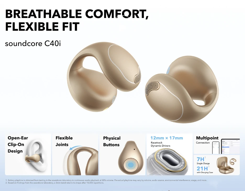 The soundcore C40i offers a unique open-ear clip-on design that keeps you aware of your surroundings while delivering full, rich sound. Equipped with 12 × 17 mm titanium-coated drivers, Bluetooth 5.4, multipoint device support, and fast-charge capability (10 minutes = 2 hours playback), it’s built for active users who want comfort, durability (1,000-bend flexible joints) and clear AI-enhanced calls, all without isolating you from the world around you.