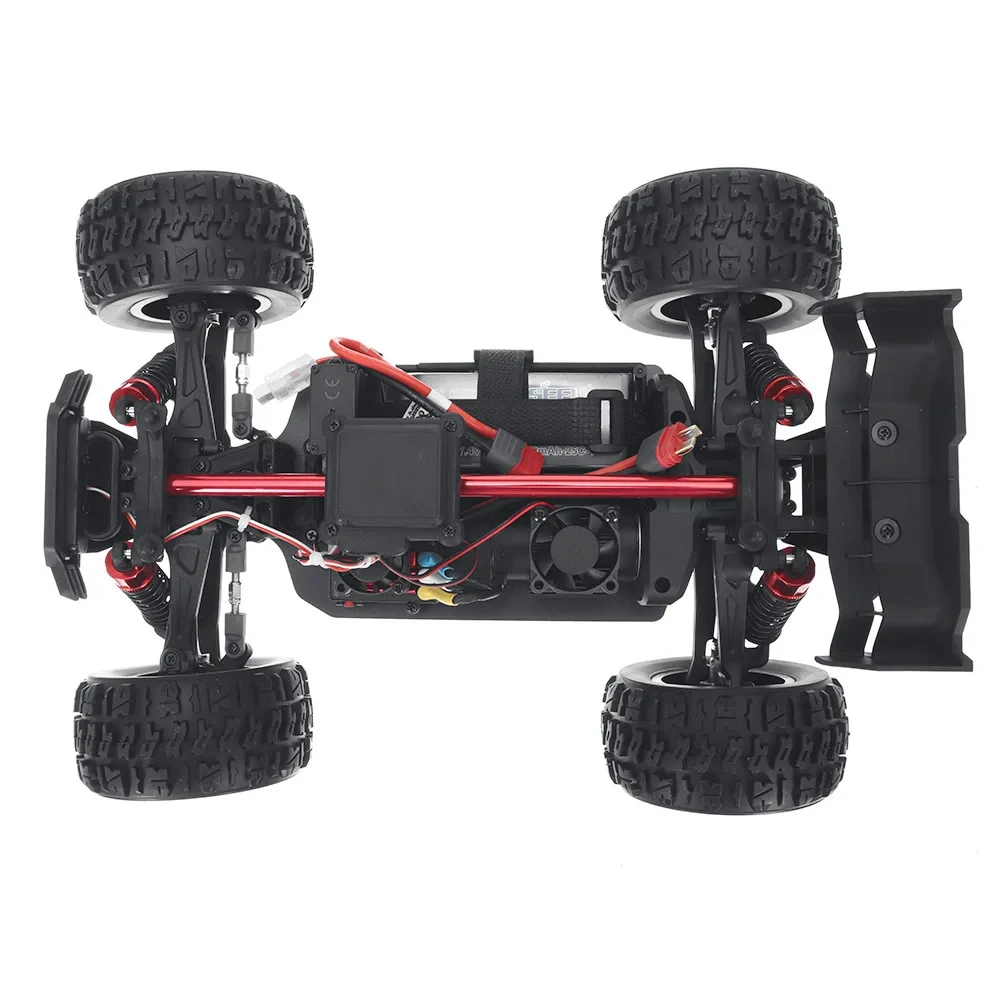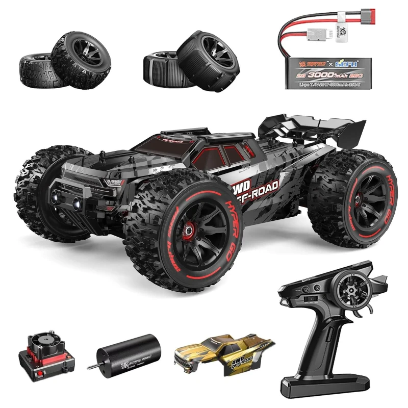 Powered by a brushless 2852 motor and a 45A ESC (compatible with 2S/3S batteries), this truck can reach speeds of up to 73 km/h when unlocked for 3S use. It includes oil-filled adjustable shock absorbers, full metal gear transmission, and ball bearings for smooth and durable performance. The 2.4 GHz 3-channel radio reaches a control range of about 120 m. The truck comes ready to run (RTR), with USB charging, tools, spare tires, and two interchangeable car shells (black and gold).