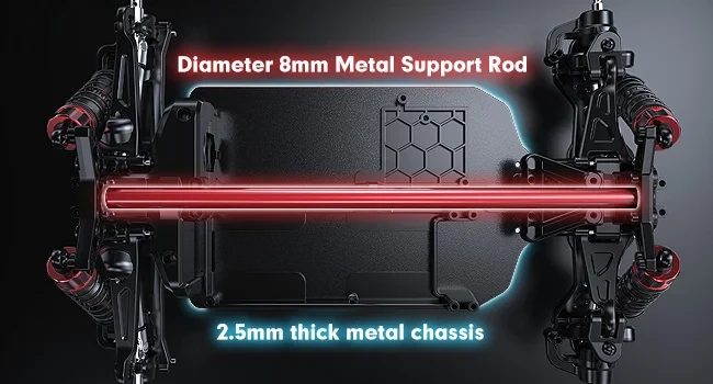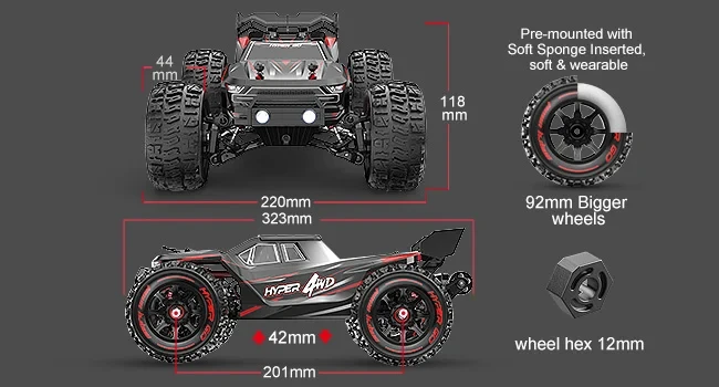 The MJX Hyper Go 14210 is built for extreme speed and off-road bashing. It features a rugged aluminum-alloy chassis, steel differential outdrives, metal gearbox internals, and a heavy-duty drivetrain including universal telescopic drive shafts. A composite front bumper helps absorb impacts so you can tackle rough terrain without worry.