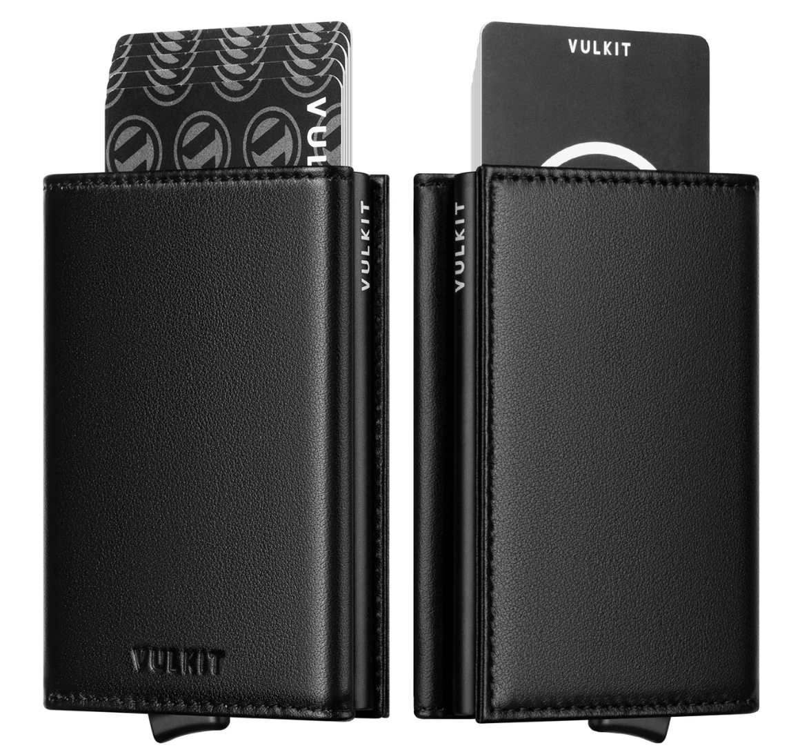VULKIT VC208P- Genuine Leather, without Back Zipper Slot, Magnetic Strip Closure Tri-Fold Wallet – Black