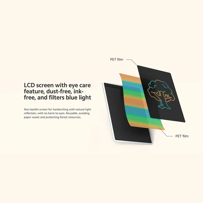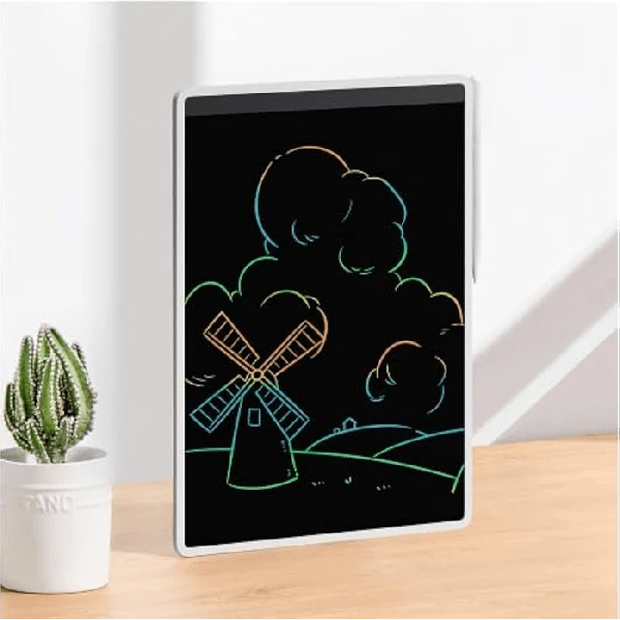 The Xiaomi LCD Writing Tablet 13.5 inches Color Edition offers a vibrant and portable drawing experience with a full palette of colors. Featuring a custom-made color liquid crystal film with gradient partitioning, it allows natural brushstrokes that change width with pressure. The magnetic pen stores safely in a designed nook, and the screen clears effortlessly with a simple tap on the Hall sensor area. Its lightweight, narrow bezel design provides a large canvas for writing or sketching anywhere. The dust-free, ink-free LCD screen protects your eyes with blue light filtering and natural light reflection, while the long-lasting battery supports up to a year of use with frequent screen clears.