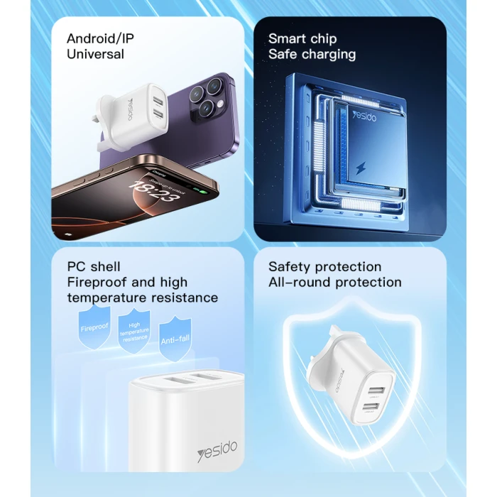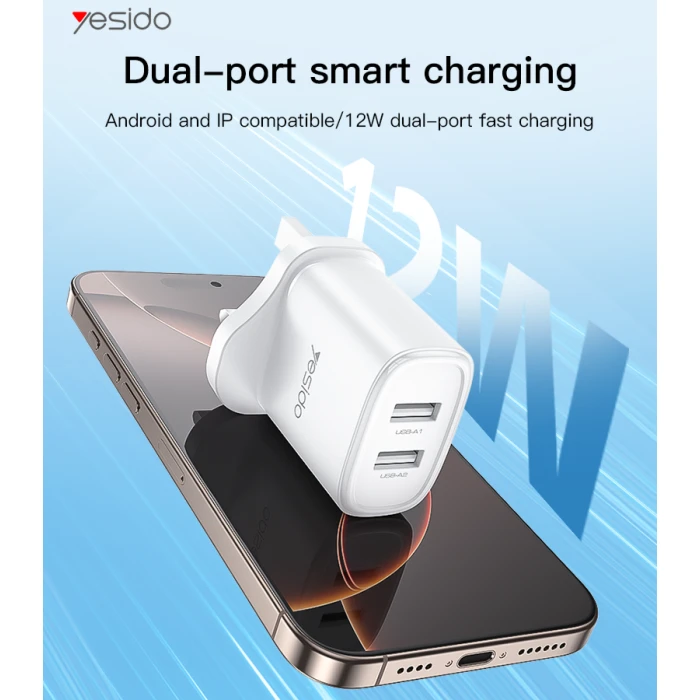 The Yesido YC91 Wall Charger is a compact and efficient charging solution featuring two USB-A ports, each supporting up to 12W fast charging. Designed with UK plug compatibility, it's suitable for charging mobile phones, tablets, and other devices. Constructed from ABS+PC materials, it ensures durability. With an input range of AC100-240V at 50/60Hz, the charger is versatile for international use.