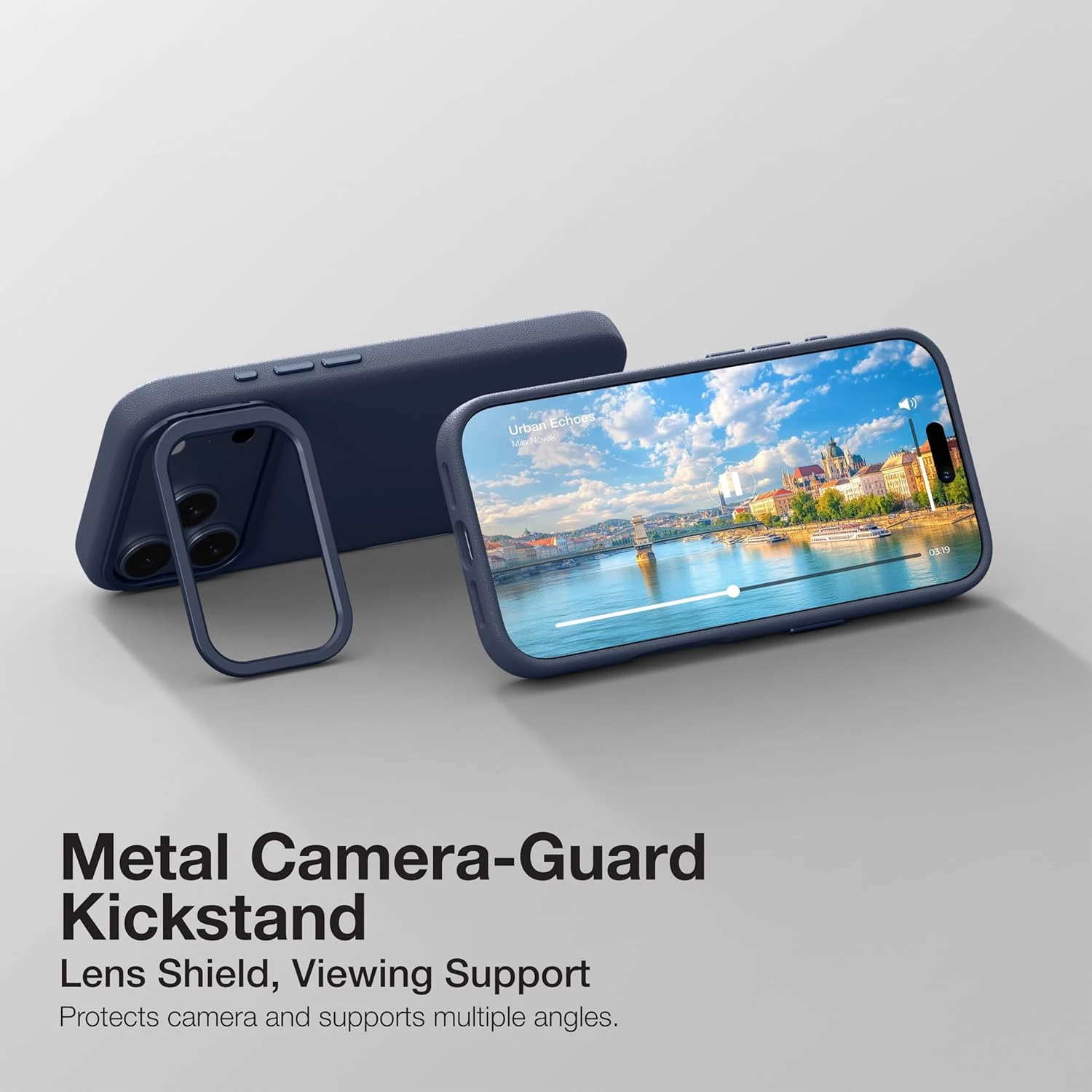 • Built-in metal camera-guard kickstand for lens protection and hands-free viewing