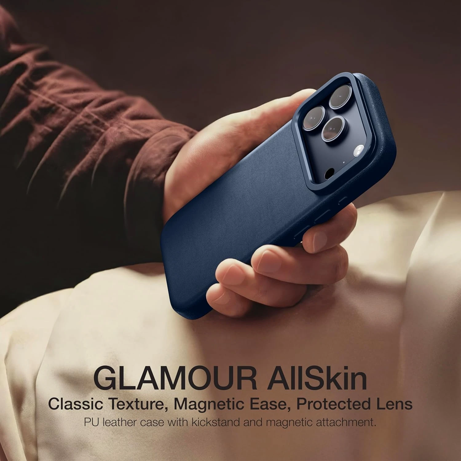 The AmazingThing Glamour AllSkin LenStand MagSafe Case for iPhone 17 Pro Max redefines premium protection with elegance and innovation. Designed with smooth vegan leather that feels soft to the touch, it develops a timeless texture over time, blending style with durability. The integrated metal kickstand provides dual functionality—acting as a camera lens protector when closed and transforming into a hands-free stand when opened.