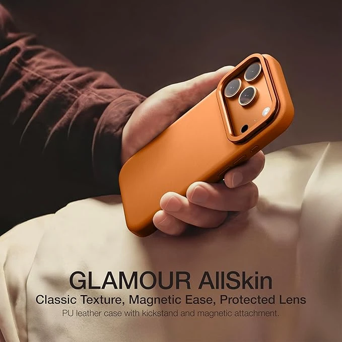 The AmazingThing Glamour AllSkin LenStand MagSafe Case for iPhone 17 Pro redefines premium protection with elegance and innovation. Designed with smooth vegan leather that feels soft to the touch, it develops a timeless texture over time, blending style with durability. The integrated metal kickstand provides dual functionality—acting as a camera lens protector when closed and transforming into a hands-free stand when opened.