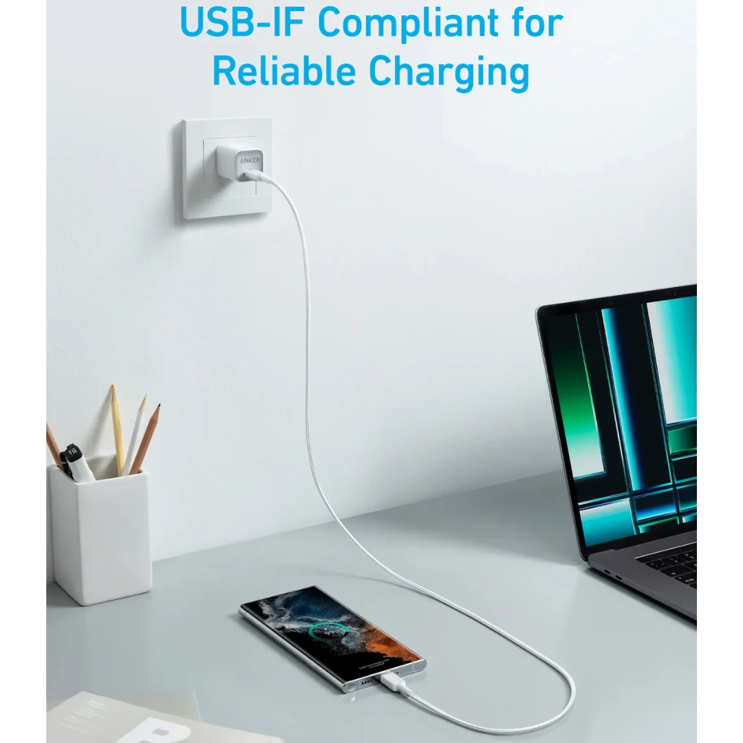 The Anker 322 USB-C to USB-C Cable offers fast, reliable charging with advanced technology trusted by over 80 million users. It supports high-speed charging, capable of powering a Samsung S23 to 55% in just 30 minutes when paired with a compatible Power Delivery charger (charger not included). Built to last, this cable has passed rigorous lab tests to endure up to 12,000 bends, ensuring long-term durability. Fully USB-IF compliant, it guarantees safe and efficient charging for virtually any USB-C device, including the latest iPhones with Type-C charging.