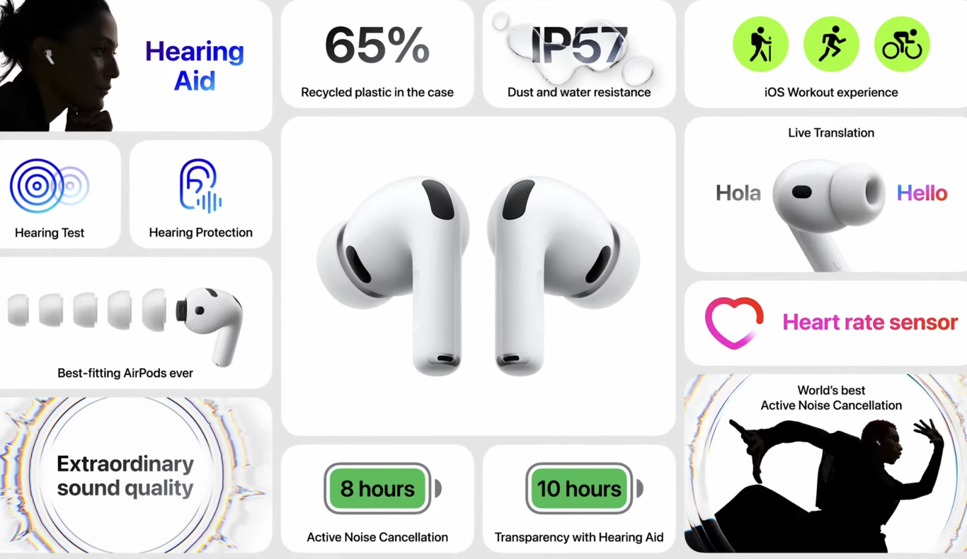 Apple’s AirPods Pro 3 deliver enhanced sound, features, and innovation. Alongside Active Noise Cancellation, they introduce Live Translation (beta) for real-time in-ear voice translation. Using Apple Intelligence and the Translate app, you can converse naturally while your AirPods translate speech between languages.