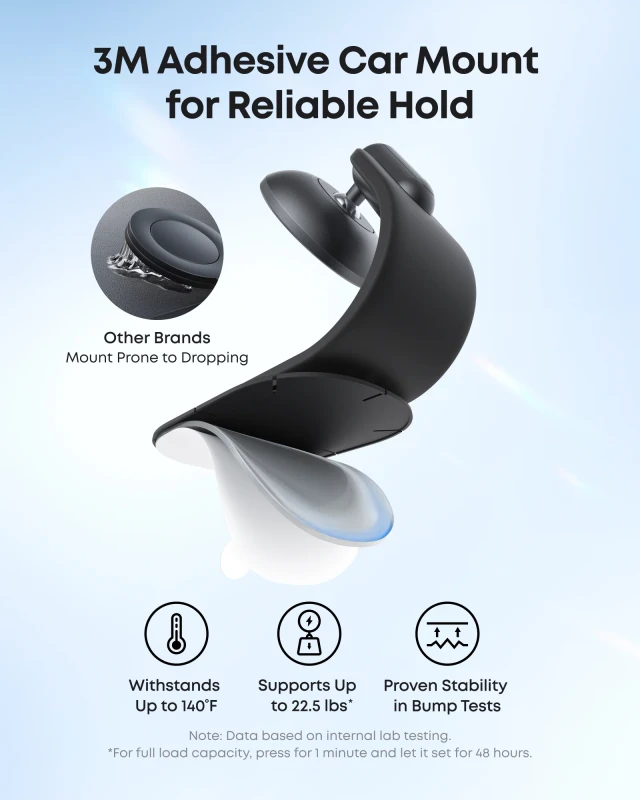 The Anker 360 Adjustable Magnetic Car Mount (A9110H11) offers a seamless and secure way to keep your iPhone in place while driving. Crafted from flexible memory alloy, this mount conforms perfectly to curved dashboards and flat surfaces alike, providing a stable and customizable fit. With a powerful 16N magnetic hold (supports up to 22.5 lbs), it ensures your device stays locked in position even on the bumpiest rides. The 360° magnetic pad and 45° adjustable tilt allow for easy angle adjustments for optimal viewing while driving. The 3M heavy-duty adhesive base with hook-and-loop fasteners provides both secure attachment and effortless detachment when not in use. Designed for MagSafe iPhones, it delivers a strong, shake-free magnetic connection — perfect for any dashboard material, including leatherette, plastic, wood, or metal.