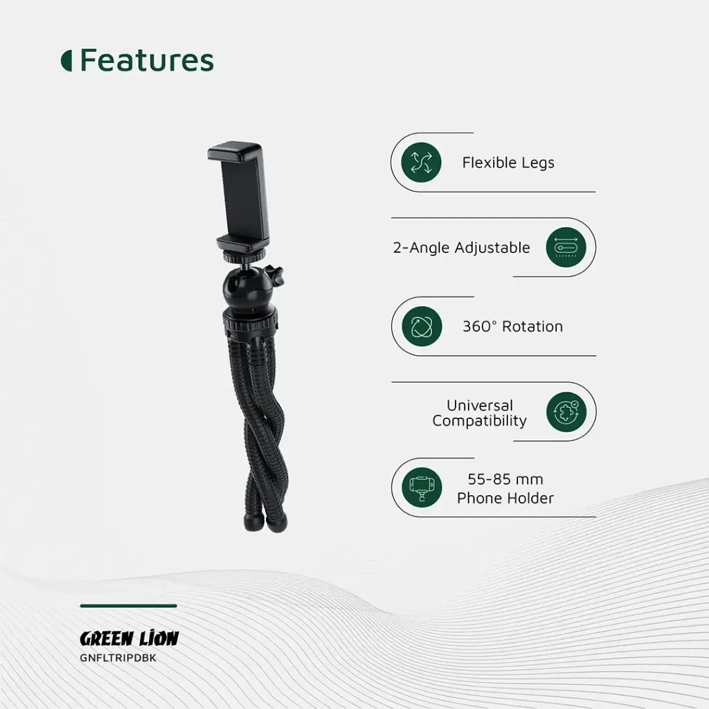 The Green Lion Flexible Tripod with Foam Grip is designed to give you full flexibility in photography and videography. Built from durable ABS, TPR, and aluminum, it is both lightweight and strong, supporting up to 3kg of devices. The adjustable phone holder fits phones sized 55-85mm, while the articulated legs allow versatile positioning even on uneven ground. With its smooth pan & tilt movement and 2-angle adjustability, this tripod ensures stability and creativity whether indoors or outdoors. A reliable and universal tool for capturing the perfect shot.