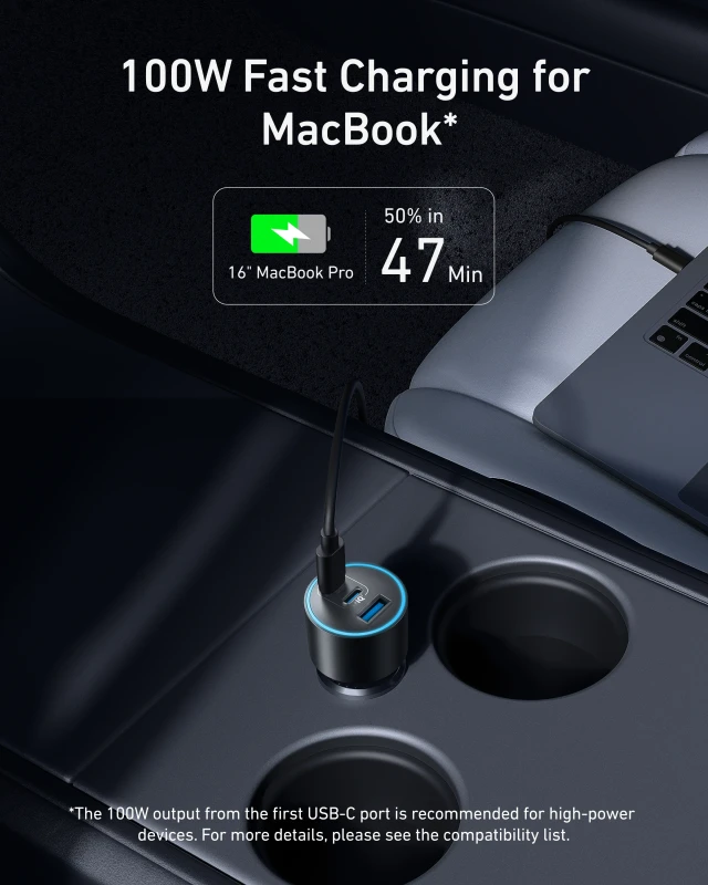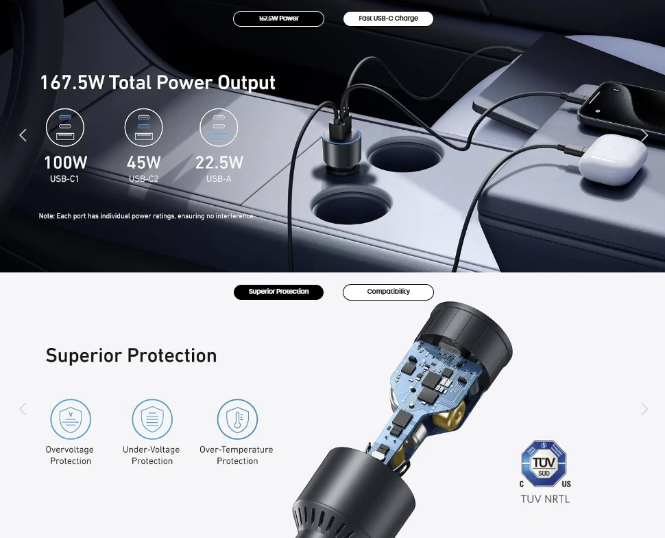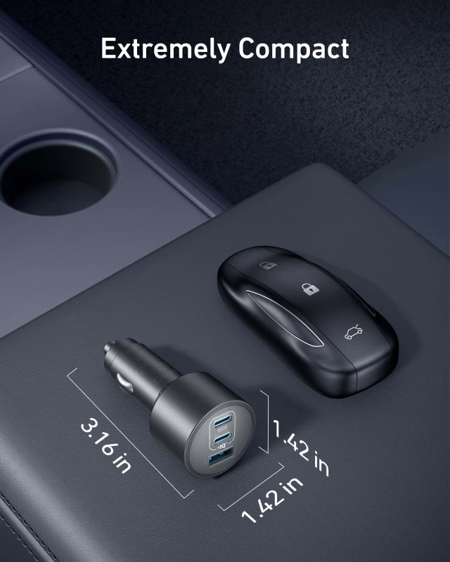 The Anker Nano Car Charger (B2737HA1) is a compact powerhouse designed to keep your devices charged during your travels. With a total output of 167.5W, it features two USB-C ports delivering 100W and 45W respectively, and a USB-A port providing 22.5W. This allows you to charge up to three devices simultaneously, including laptops, smartphones, and tablets. The charger is compatible with various input voltages (12V–24V DC), making it suitable for most vehicles. It comes with a 3.3 ft USB-C to USB-C cable, ensuring fast and efficient charging. Its ultra-compact design ensures it won't clutter your car's interior, while advanced safety features protect your devices from overvoltage, overheating, and short circuits