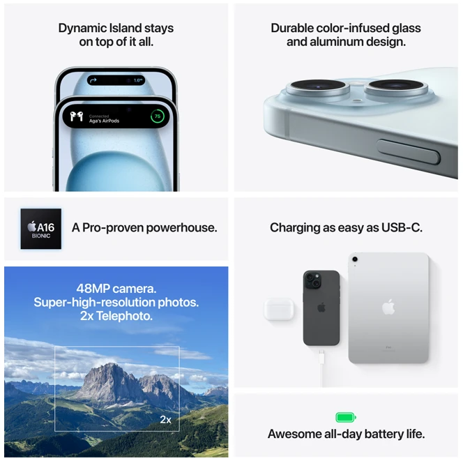 The Apple iPhone 15 delivers a sleek, modern design with powerful everyday performance in a stunning blue finish. Featuring a bright 6.1-inch Super Retina XDR display, Dynamic Island for real-time alerts, and a durable color-infused glass and aluminum body, it offers a premium experience from every angle. Powered by the A16 Bionic chip, the iPhone 15 handles multitasking, gaming, and photography with exceptional smoothness. The advanced 48MP main camera captures high-resolution photos, vibrant colors, and impressive low-light performance. With USB-C charging, all-day battery life, and 5G connectivity, the iPhone 15 is built for speed, convenience, and reliability. A perfect choice for users seeking performance, style, and Apple’s signature ecosystem in a compact form.