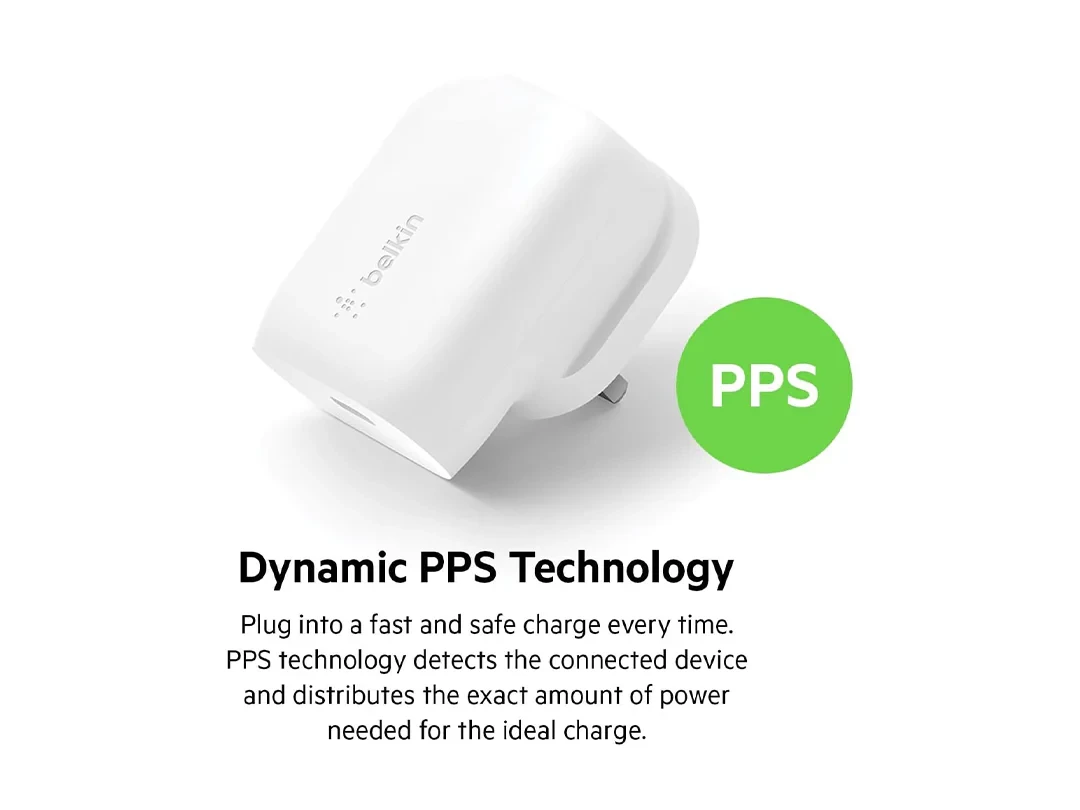 The Belkin BoostCharge 30W USB-C Wall Charger with PPS delivers fast, safe, and efficient charging for your devices. With USB-C Power Delivery 3.0 and PPS technology, it automatically adjusts power output for optimal performance. Capable of charging an iPhone 13 from 0–50% in just 24 minutes or a Samsung Galaxy S22 Ultra in 21 minutes, it’s ideal for on-the-go charging. Its slim, flat-to-wall design makes it perfect for tight spaces, while the compact and travel-ready build ensures convenience anywhere.