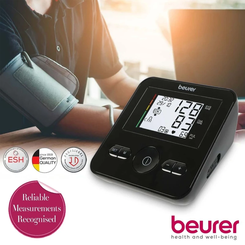 The Beurer BM30 Upper Arm Blood Pressure Monitor makes home health monitoring simple, accurate, and reliable. Designed with seniors and families in mind, this clinically validated device ensures precise readings with ease of use. It features a large display, fully automatic operation, and intelligent data tracking. The BM30 detects arrhythmia, includes a risk indicator with a colored scale, and stores up to 30 readings for four different users. With a comfortable cuff suitable for 22–36 cm arm circumferences, it’s the perfect choice for preventive health care at home.