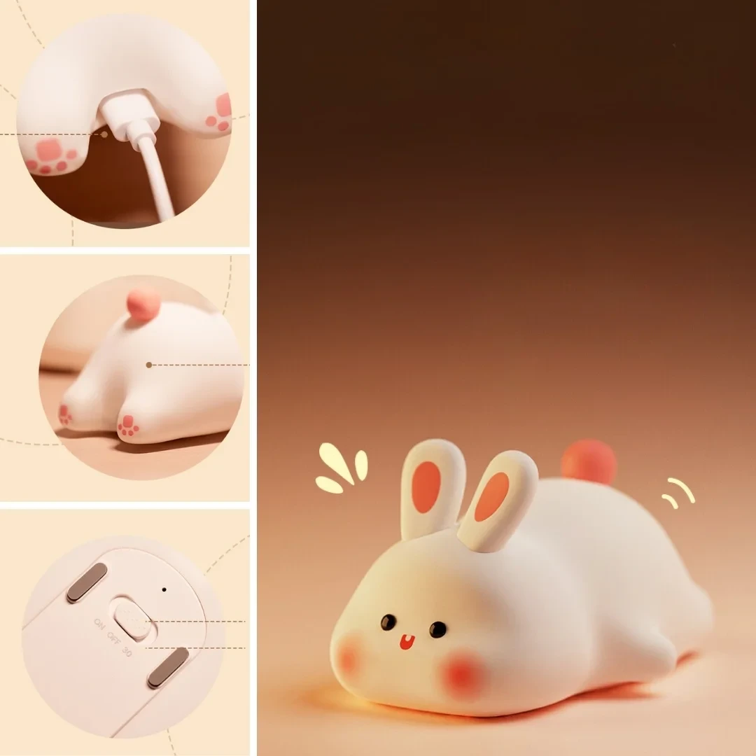 The Big Face Rabbit Silicone Night Light (K-1153) combines playful design with functional lighting, making it an excellent choice for children's bedrooms. Crafted from soft silicone, it offers a comfortable and safe touch experience. Users can select from three brightness levels—30% (Dim Light), 60% (Medium Light), and 100% (Bright Light)—to create the desired ambiance. The touch-sensitive surface allows for easy operation; a simple press activates the light. This night light is both affordable and charming.
