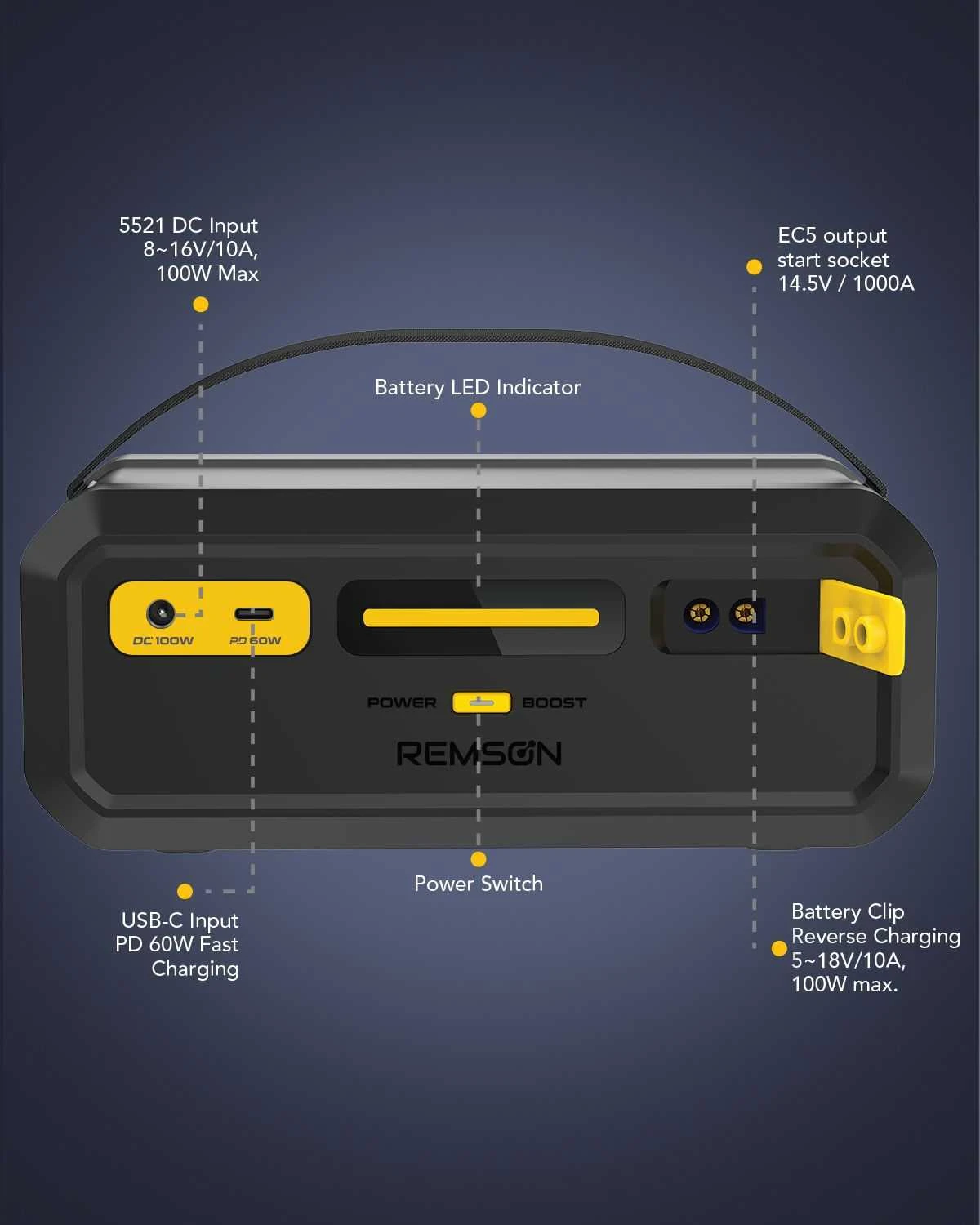 The Remson Re-Boost Mate Portable Emergency Car JumpStarter is a powerful and reliable solution for reviving your vehicle anytime, anywhere. With a peak current of 1000A, it can jump-start almost all 12V vehicles including cars, SUVs, trucks, motorcycles, boats, and even large-capacity engines up to 9.0L Gas / 7.0L Diesel.