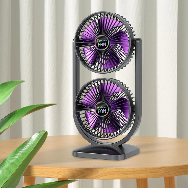The Coolness Double Dual Head Desktop Fan (S30) is a compact and portable fan designed for personalized cooling. Featuring two independent fan heads with individual control switches and three-speed settings, it allows easy adjustment of airflow and direction. Powered by a 3.7V rechargeable battery with a 3W output, it's perfect for desktops, bedrooms, or office use, and comes in a stylish Grey/Purple color.