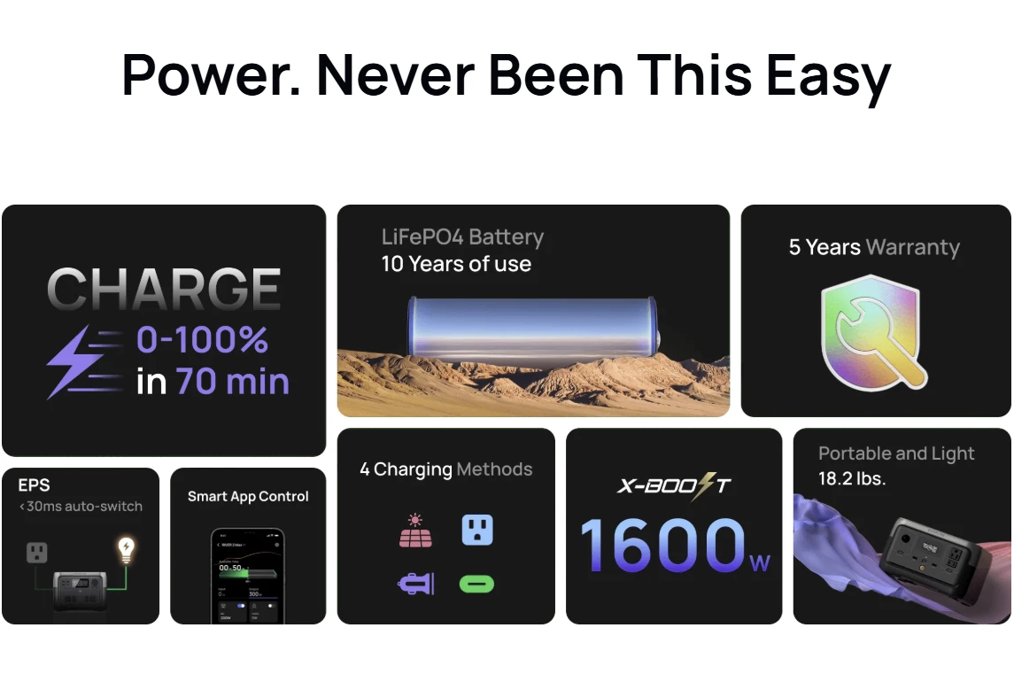 This power station supports four charging methods — AC, car, solar, and USB-C — giving you flexibility wherever you are. Paired with the EcoFlow Smart App, you can monitor performance, control settings, and check battery levels remotely via Bluetooth or Wi-Fi.