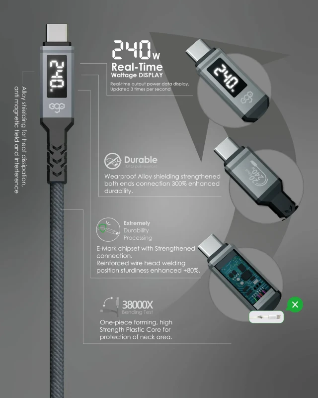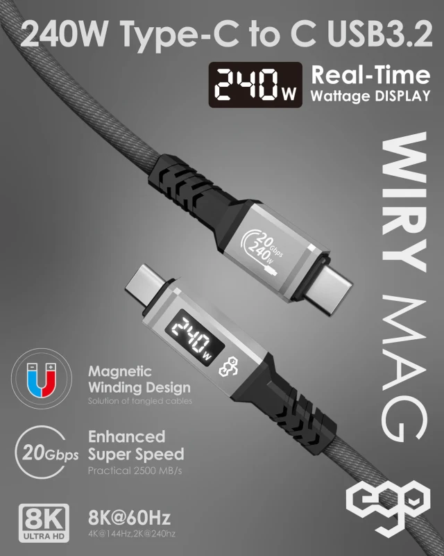 The EGO Wiry Mag 240W Cable combines ultra-fast charging with high-speed data transfer in a sleek magnetic design. With support for USB-3.2 Gen2x2, it delivers 20Gbps transfer, 8K video, and up to 240W charging power. Durable alloy construction, auto-winding storage, and wide device compatibility make it a reliable choice for everyday use.