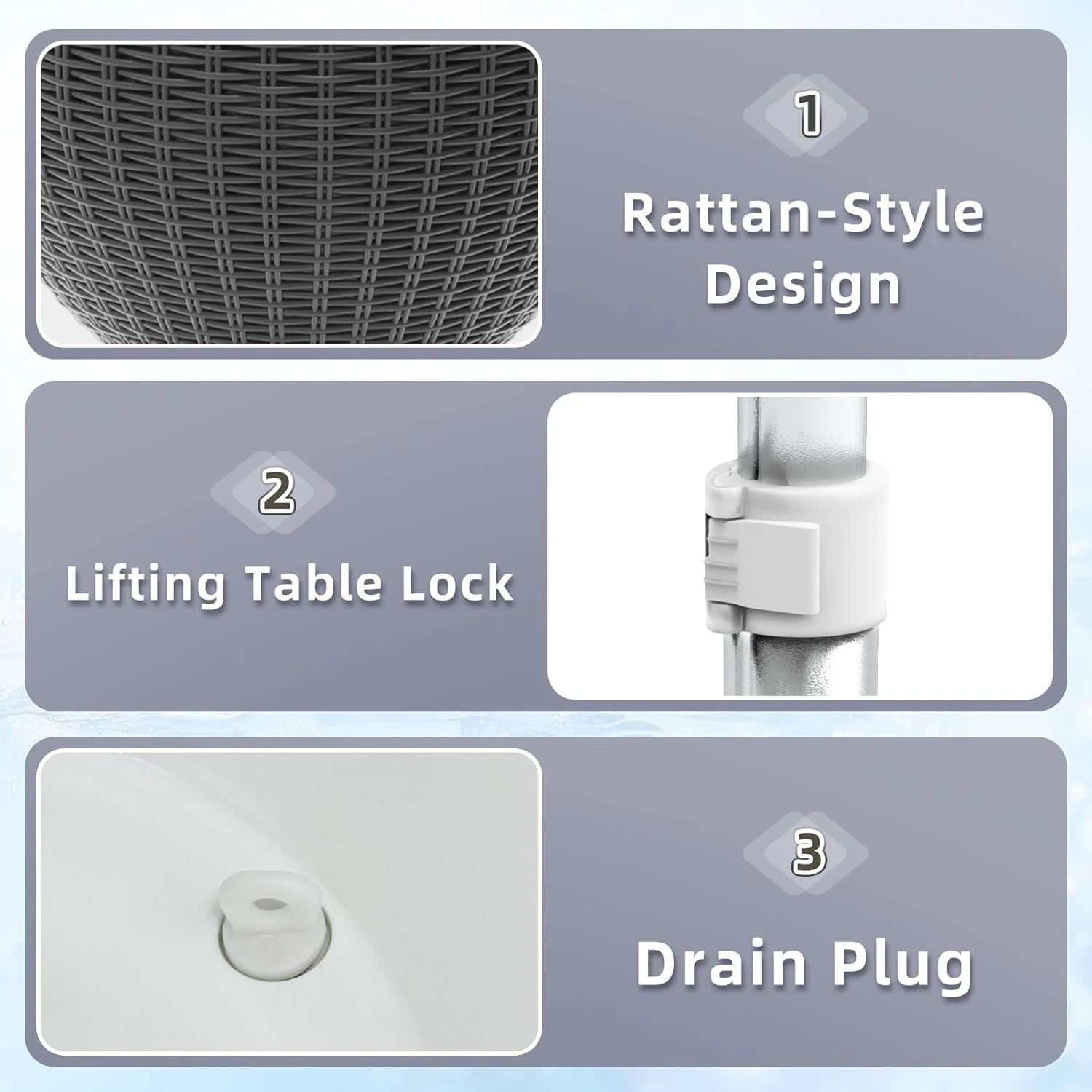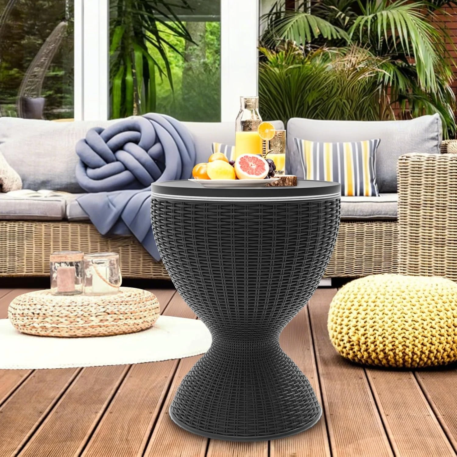 The El Baba Portable Outdoor Ice Cooler Table is the ultimate party companion, combining functionality, style, and durability. With its pop-up bar design and hidden 8-gallon cooler, it can chill up to 40 cans, keeping your drinks cold and within reach. Built from rust-proof resin with a rattan-look finish, it withstands all weather conditions while blending seamlessly with outdoor décor. Easy to clean with its built-in drainage plug, this table is perfect for poolside gatherings, parties, and barbecues. Use it as a coffee table when closed or a bar table when raised, offering versatility and convenience for any outdoor occasion.