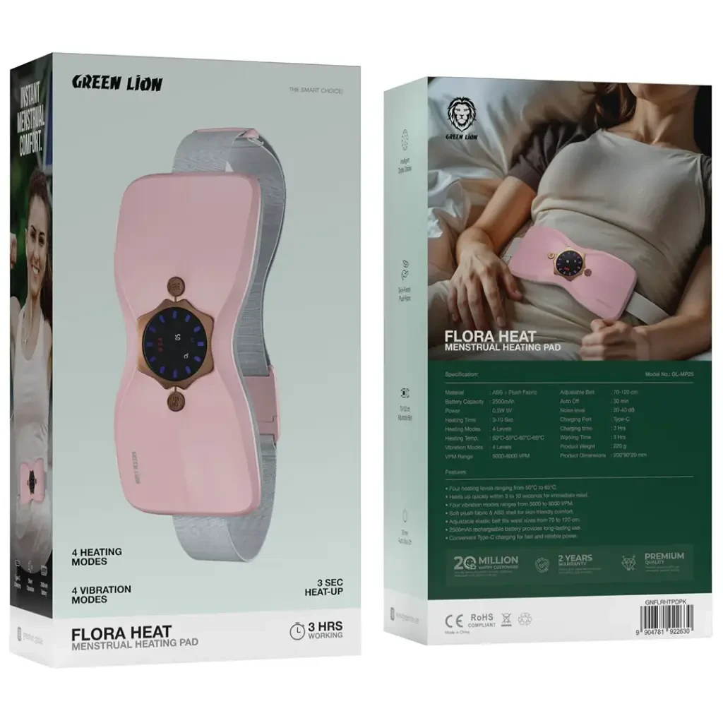 The Green Lion Flora Heat Menstrual Heating Pad (GL-MP20) offers advanced comfort and relief during menstrual discomfort. Featuring a built-in 2500mAh battery, it provides up to 3 hours of continuous warmth. The heating function activates within 3 seconds, with adjustable temperatures ranging between 50°C to 65°C, allowing personalized comfort. It also offers four vibration modes, delivering customizable soothing sensations between 5000–8000 VPM. The intelligent digital display provides easy temperature and mode control, while the soft plush fabric ensures skin-friendly comfort. An adjustable belt (70–120cm) secures a perfect fit, and the auto shut-off feature after 30 minutes ensures safety. The device operates quietly (20–40 dB) and charges fully via Type-C in 3 hours, making it a perfect choice for effective pain relief and relaxation.