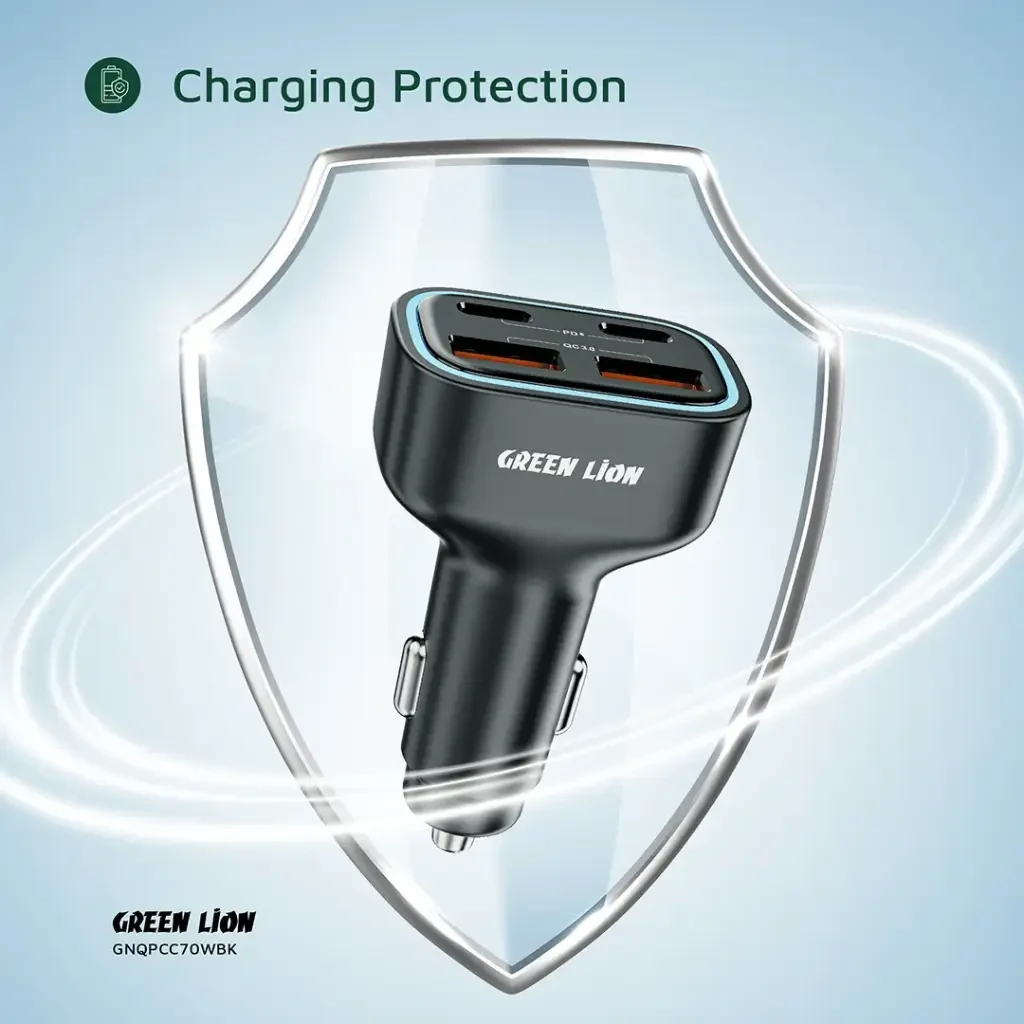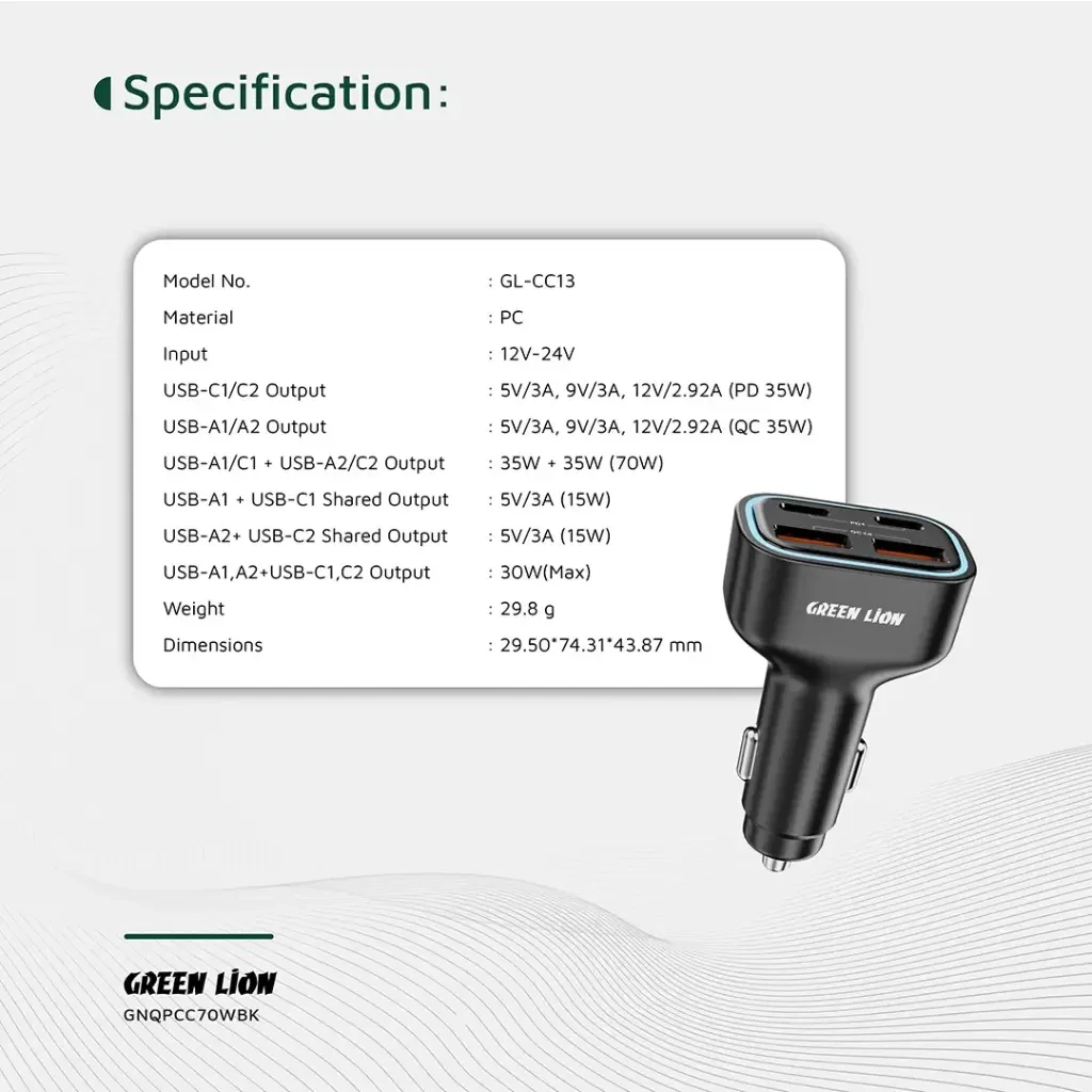 The Green Lion 4-Port Car Charger 70W Max is a powerful and versatile charging companion for all your travels. Built with durable PC material, it supports 12V–24V input, making it suitable for almost any vehicle. With two USB-C and two USB-A ports, it provides fast charging of up to 35W each via PD and QC, while delivering a total combined output of 70W. This allows you to charge up to four devices simultaneously with ease. Designed with safety in mind, it includes charging protection to keep your devices secure. Its compact body and blue ambient LED make it both practical and stylish, ensuring convenience even in low-light conditions.