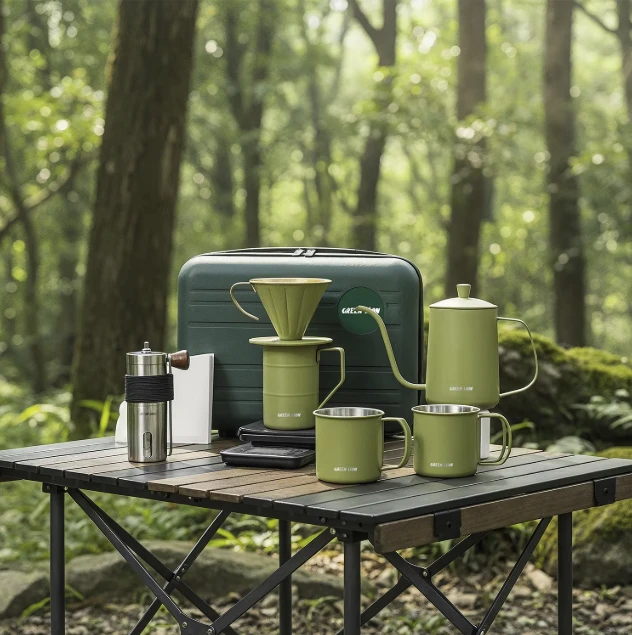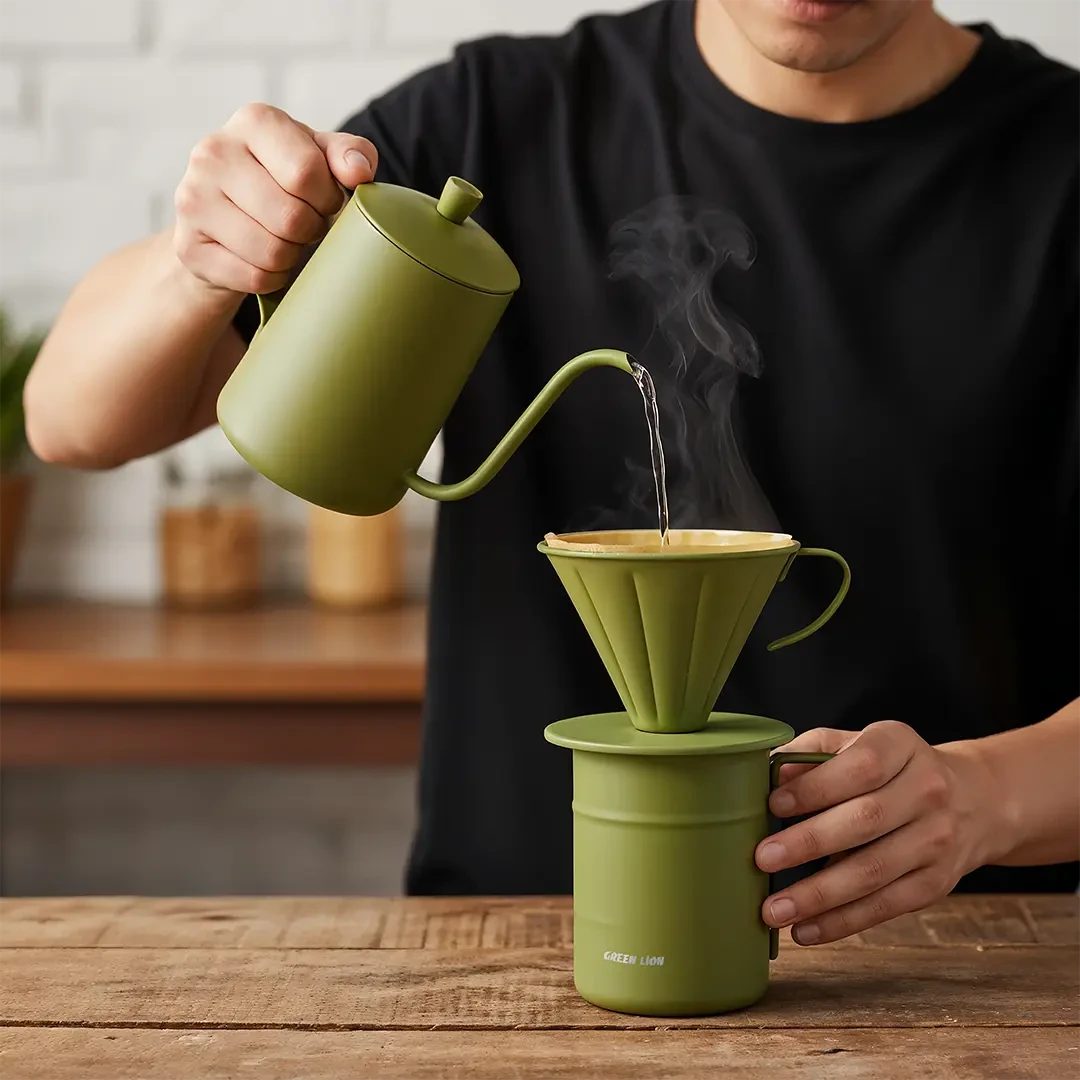 The Green Lion V-60 Pro Coffee Maker Set – Green is a complete 7-in-1 pour-over kit for coffee lovers who want café-style brewing at home, in the office, or on the go. The set includes a gooseneck kettle for precise pouring, an adjustable hand grinder for consistent coffee grounds, and a V60-style pour-over dripper for clean, aromatic extraction. You also get two stainless steel cups to enjoy your brew, a precision scale to control your recipe, and 100 V60-02 paper filters to keep your coffee smooth and clear. All items are neatly packed in a travel case, making it easy to carry for trips, camping, or outdoor brewing, so you can enjoy professional-style pour-over coffee anywhere.